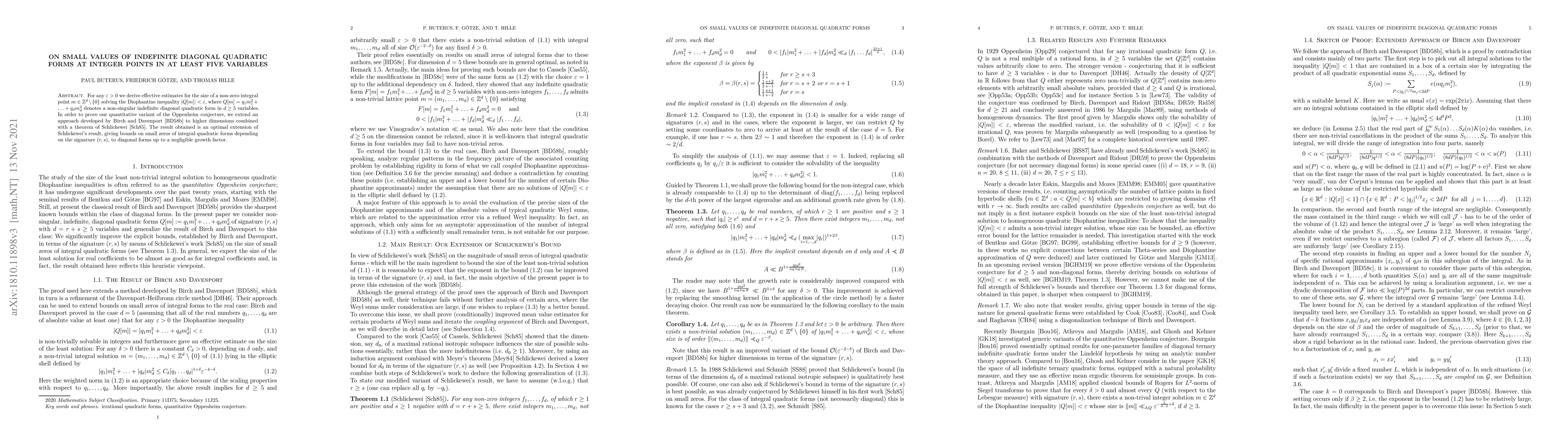 This paper provides effective estimates for the size of non-zero integer solutions to the Diophantine inequality of indefinite diagonal quadratic forms in at least five variables. The result extends the approach of Birch and Davenport and Schlickewei's theorem to higher dimensions, yielding an optimal extension of bounds on small zeros of integral quadratic forms.