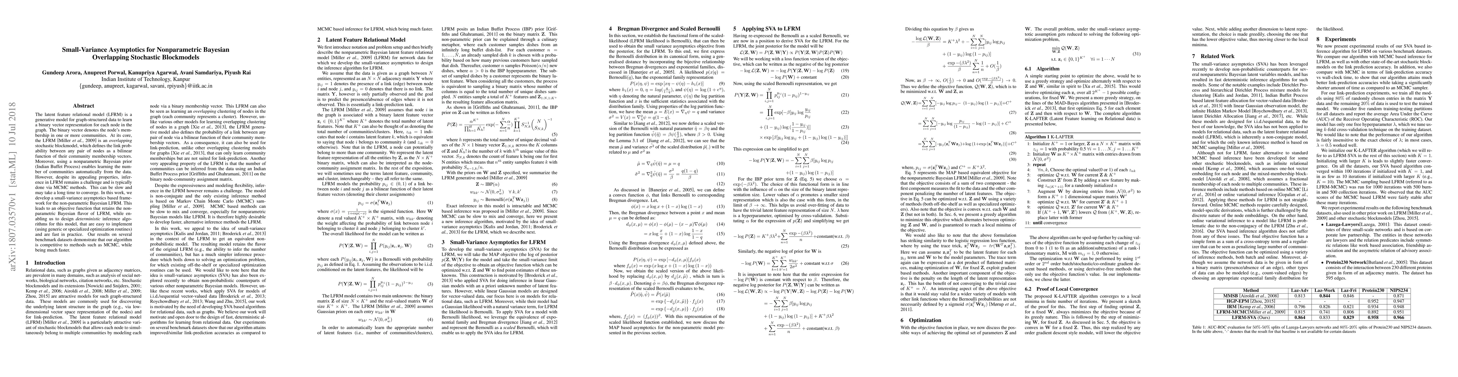 This paper develops a small-variance asymptotics framework for the latent feature relational model (LFRM), a nonparametric Bayesian overlapping stochastic blockmodel, to enable fast deterministic inference algorithms. The proposed method retains the nonparametric flavor while outperforming traditional MCMC methods in speed on benchmark datasets.