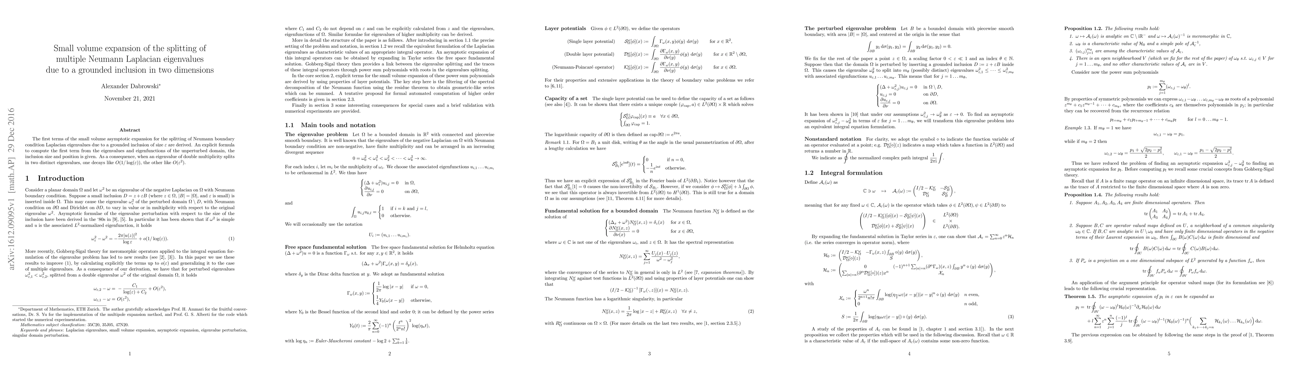 The first terms of the small volume asymptotic expansion for the splitting of Neumann boundary condition Laplacian eigenvalues due to a grounded inclusion of size {\epsilon} are derived. An explicit formula to compute the first term from the eigenvalues and eigenfunctions of the unperturbed domain, the inclusion size and position is given. As a consequence, when an eigenvalue of double multiplicity splits in two distinct eigenvalues, one decays like O(1/log({\epsilon})), the other like O({\epsilon}^2).