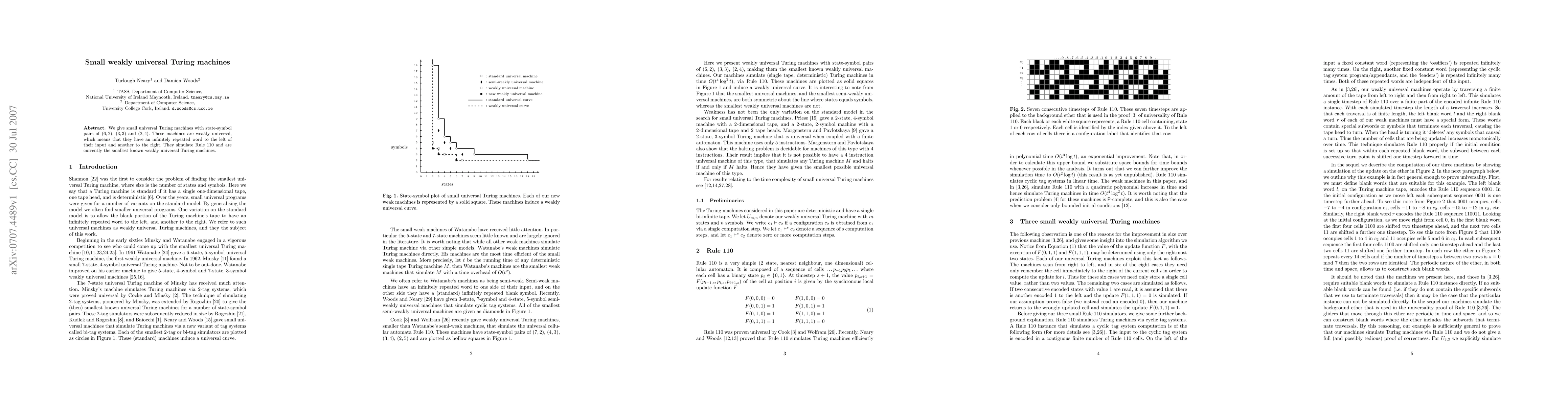 This paper presents small weakly universal Turing machines with state-symbol pairs of (6, 2), (3, 3), and (2, 4) that simulate Rule 110, making them the smallest known of their kind. These machines operate with an infinitely repeated word on both sides of the input.