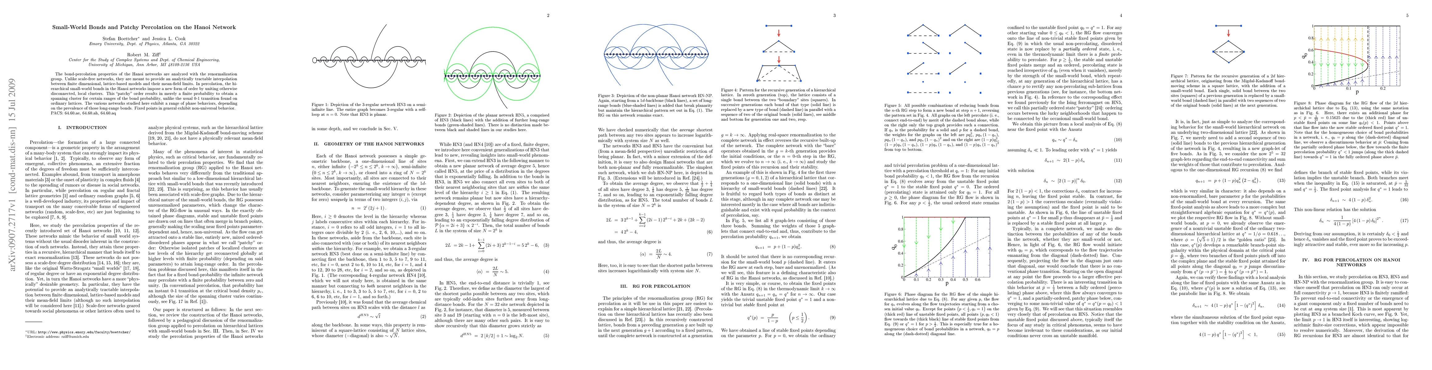 Researchers studied the Hanoi network's bond-percolation properties using the renormalization group, finding a 'patchy' order that leads to a finite probability of spanning clusters, unlike typical lattice models.