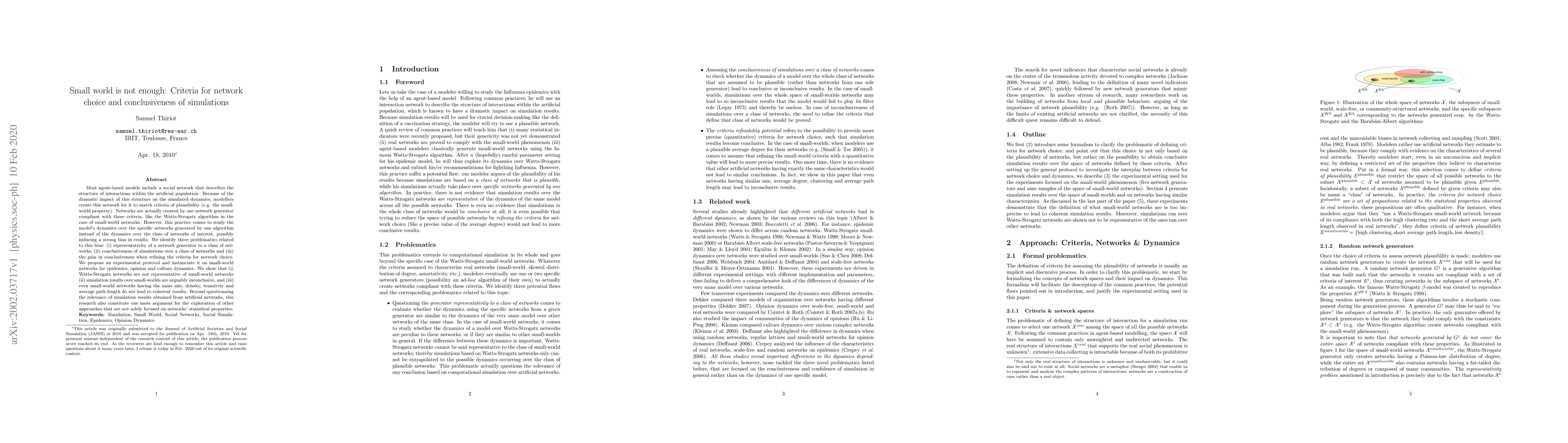 Most agent-based models include a social network that describes the structure of interactions within the artificial population. Because of the dramatic impact of this structure on the simulated dynamics, modelers create this network for it to match criteria of plausibility (e.g. the small-world property). Networks are actually created by one network generator compliant with these criteria, like the Watts-Strogatz algorithm in the case of small-world networks. However, this practice comes to study the model's dynamics over the specific networks generated by one algorithm instead of the dynamics over the class of networks of interest, possibly inducing a strong bias in results. We identify three problematics related to this bias: (i) representativity of a network generator to a class of networks, (ii) conclusiveness of simulations over a class of networks and (iii) the gain in conclusiveness when refining the criteria for network choice. We propose an experimental protocol and instantiate it on small-world networks for epidemics, opinion and culture dynamics. We show that (i) Watts-Strogatz networks are not representative of small-world networks (ii) simulation results over small-worlds are arguably inconclusive, and (iii) even small-world networks having the same size, density, transitivity and average path length do not lead to coherent results. Beyond questioning the relevance of simulation results obtained from artificial networks, this research also constitute one more argument for the exploration of other approaches that are not solely focused on networks' statistical properties.