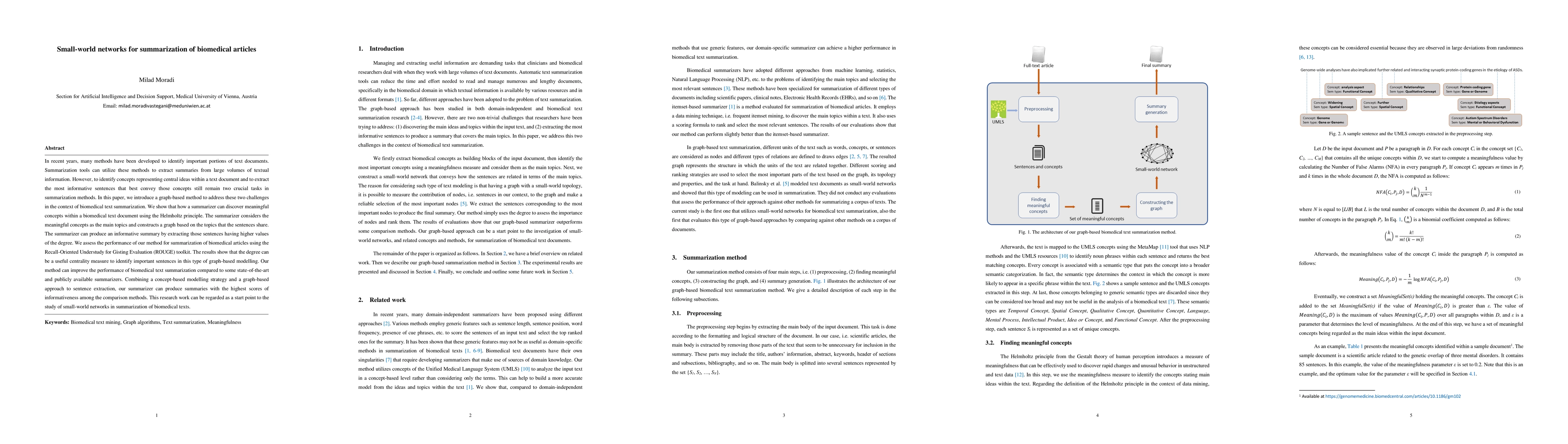This paper introduces a graph-based method for summarizing biomedical articles, utilizing the Helmholtz principle to identify key concepts and construct a network graph of shared topics. The method extracts sentences with the highest degree centrality for summarization, demonstrating improved performance over other summarizers using the ROUGE toolkit.