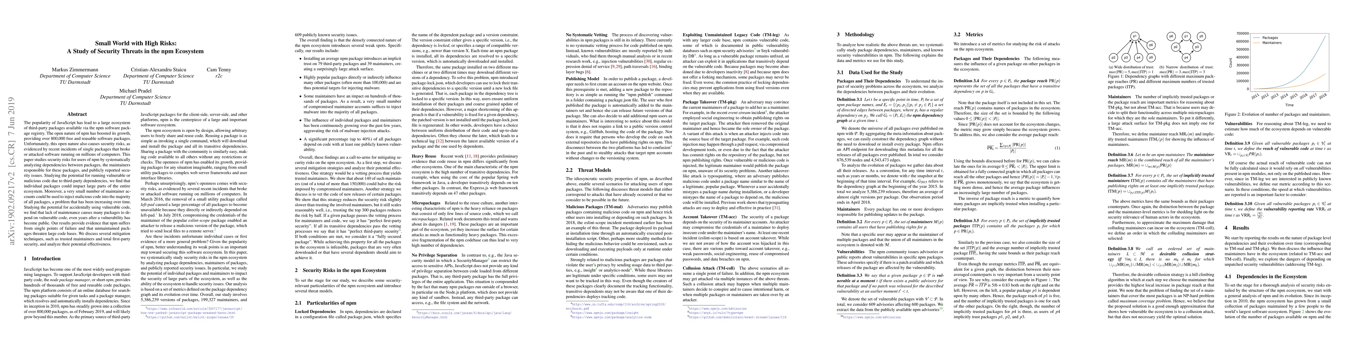 This paper investigates security threats in the npm ecosystem, revealing that a small number of maintainers can inject malicious code into many packages, posing significant risks. It also highlights that many packages remain vulnerable due to lack of maintenance, emphasizing the need for improved security measures and maintenance practices.