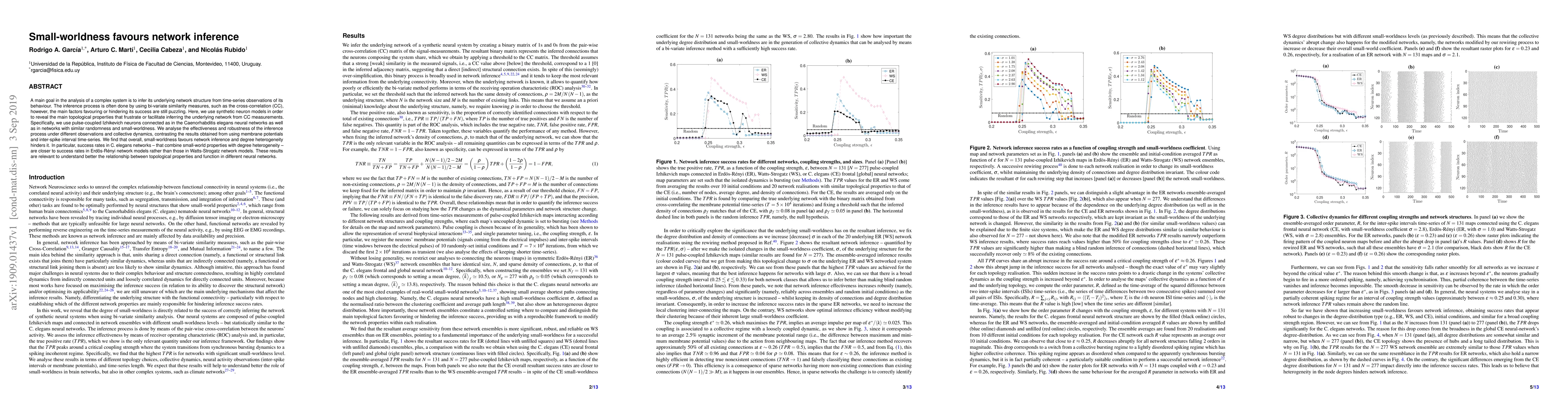 A main goal in the analysis of a complex system is to infer its underlying network structure from time-series observations of its behaviour. The inference process is often done by using bi-variate similarity measures, such as the cross-correlation (CC), however, the main factors favouring or hindering its success are still puzzling. Here, we use synthetic neuron models in order to reveal the main topological properties that frustrate or facilitate inferring the underlying network from CC measurements. Specifically, we use pulse-coupled Izhikevich neurons connected as in the Caenorhabditis elegans neural networks as well as in networks with similar randomness and small-worldness. We analyse the effectiveness and robustness of the inference process under different observations and collective dynamics, contrasting the results obtained from using membrane potentials and inter-spike interval time-series. We find that overall, small-worldness favours network inference and degree heterogeneity hinders it. In particular, success rates in C. elegans networks -- that combine small-world properties with degree heterogeneity -- are closer to success rates in Erd\"os-R\'enyi network models rather than those in Watts-Strogatz network models. These results are relevant to understand better the relationship between topological properties and function in different neural networks.