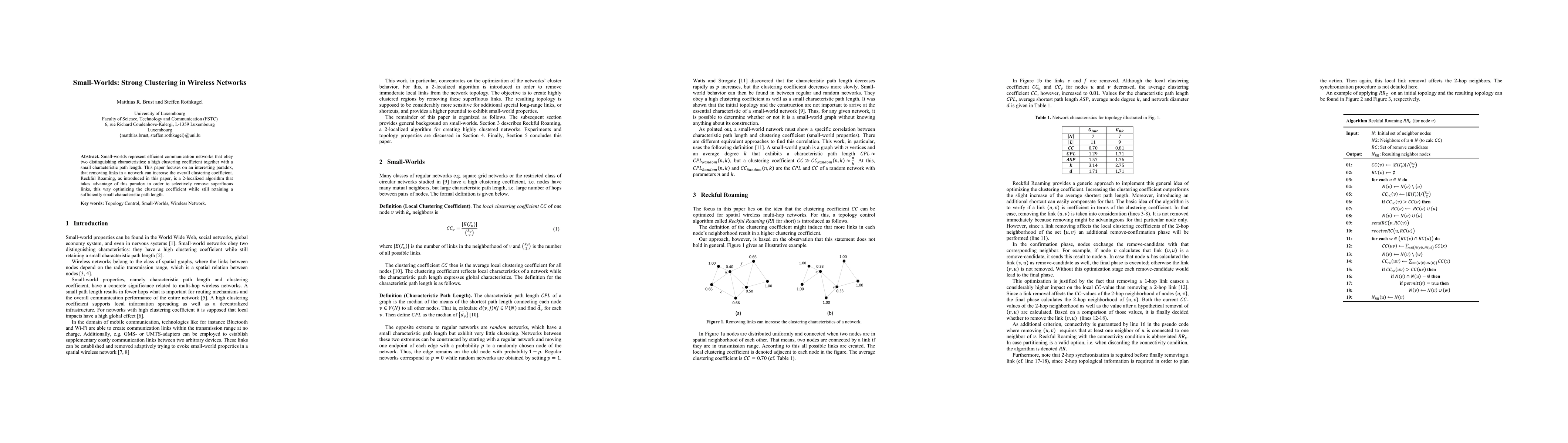 This paper explores the paradox where removing links in a network can enhance its clustering coefficient, introducing Reckful Roaming, a 2-localized algorithm that optimizes clustering while maintaining a small path length. The algorithm selectively removes unnecessary links to achieve efficient communication in wireless networks.