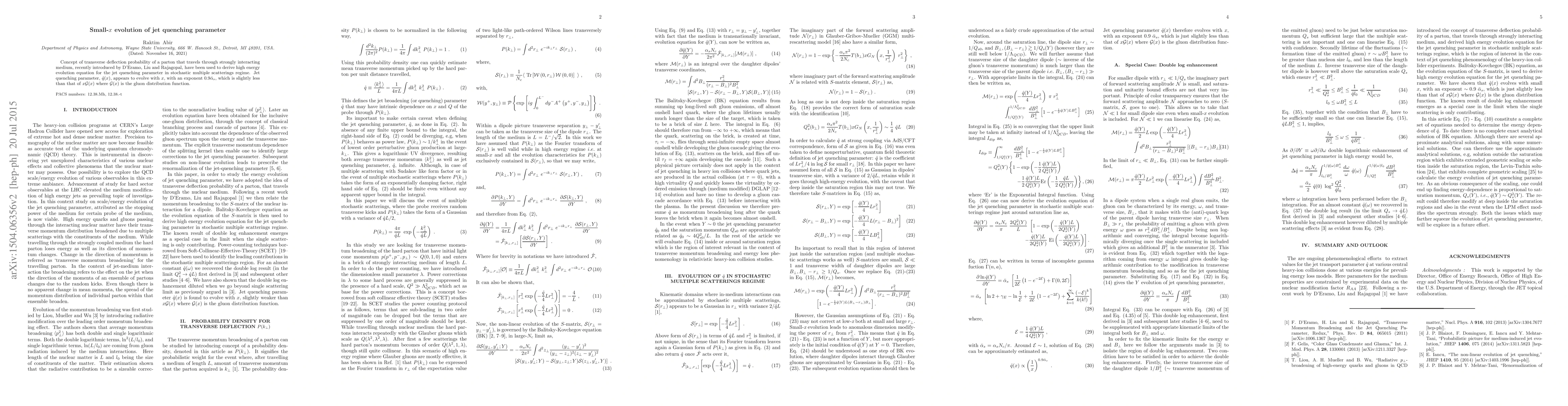 Concept of transverse deflection probability of a parton that travels through strongly interacting medium, recently introduced by D'Eramo, Liu and Rajagopal, have been used to derive high energy evolution equation for the jet quenching parameter in stochastic multiple scatterings regime. Jet quenching parameter, ${\hat q}(x)$, appears to evolve with $x$, with an exponent $0.9{\bar \alpha}_s$, which is slightly less than that of $x {\cal G} (x)$ where ${\cal G} (x)$ is the gluon distribution function.