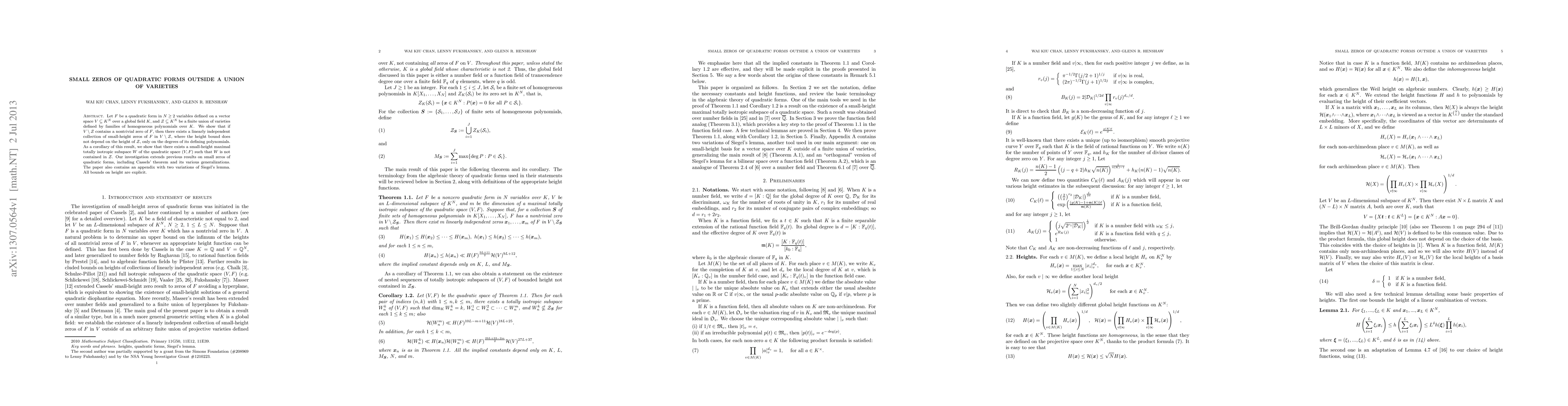 Let $F$ be a quadratic form in $N \geq 2$ variables defined on a vector space $V \subseteq K^N$ over a global field $K$, and $\Z \subseteq K^N$ be a finite union of varieties defined by families of homogeneous polynomials over $K$. We show that if $V \setminus \Z$ contains a nontrivial zero of $F$, then there exists a linearly independent collection of small-height zeros of $F$ in $V\setminus \Z$, where the height bound does not depend on the height of $\Z$, only on the degrees of its defining polynomials. As a corollary of this result, we show that there exists a small-height maximal totally isotropic subspace $W$ of the quadratic space $(V,F)$ such that $W$ is not contained in $\Z$. Our investigation extends previous results on small zeros of quadratic forms, including Cassels' theorem and its various generalizations. The paper also contains an appendix with two variations of Siegel's lemma. All bounds on height are explicit.