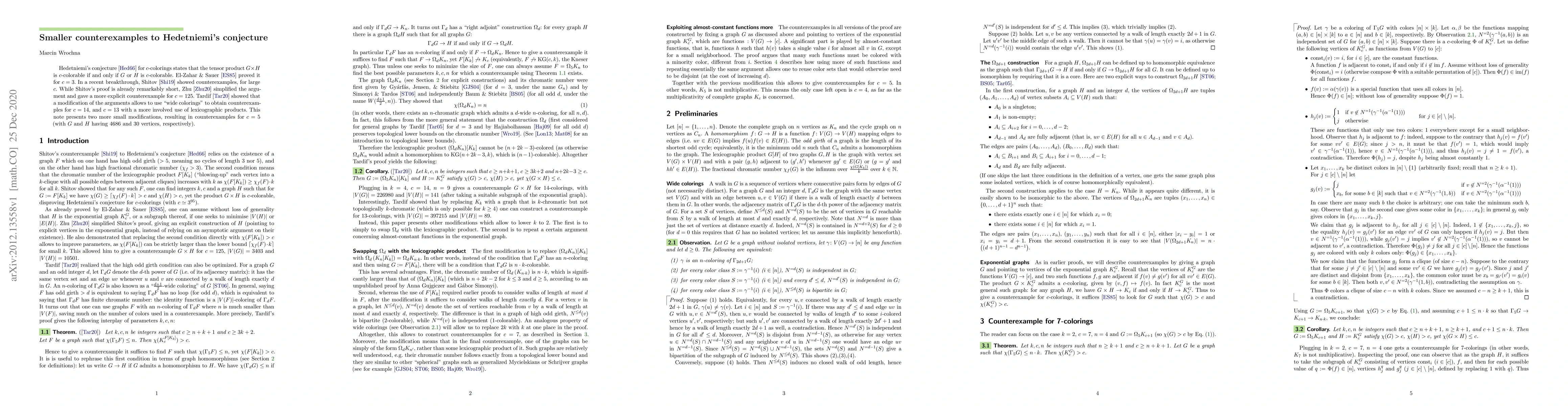 Hedetniemi's conjecture~\cite{hedetniemi1966homomorphisms} for $c$-colorings states that the tensor product $G \times H$ is $c$-colorable if and only if $G$ or $H$ is $c$-colorable. El-Zahar and Sauer~\cite{El-ZaharS85} proved it for $c = 3$. In a recent breakthrough, Shitov~\cite{Shitov19} showed counterexamples, for large $c$. While Shitov's proof is already remarkably short, Zhu \cite{Zhu20} simplified the argument and gave a more explicit counterexample for $c=125$. Tardif \cite{Tardif20} showed that a modification of the arguments allows to use ``wide colorings'' to obtain counterexamples for $c=14$, and $c=13$ with a more involved use of lexicographic products. This note presents two more small modifications, resulting in counterexamples for $c=5$ (with $G$ and $H$ having 4686 and 30 vertices, respectively).