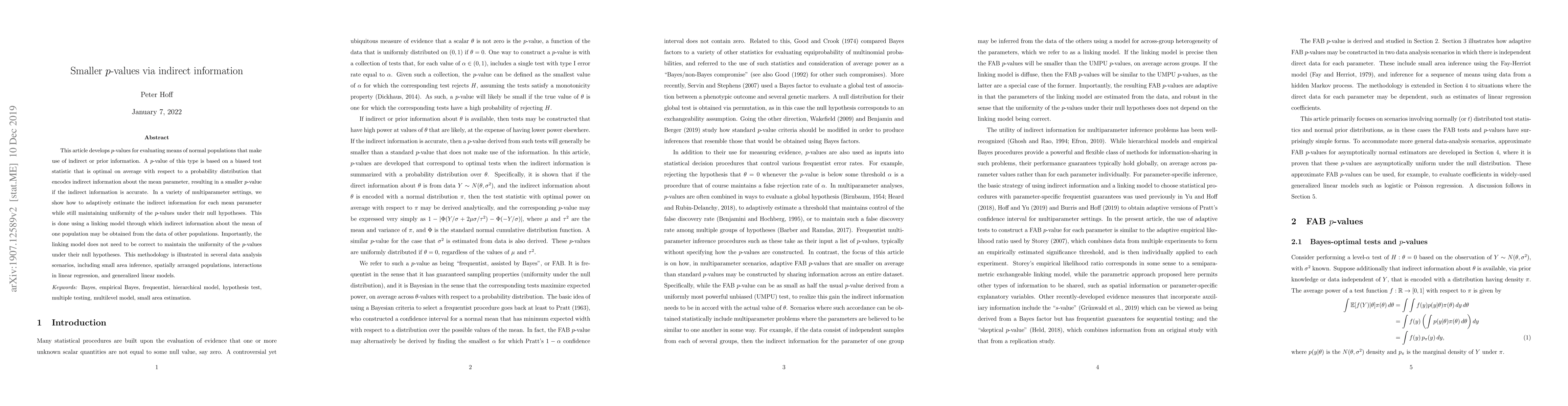 This article develops $p$-values for evaluating means of normal populations that make use of indirect or prior information. A $p$-value of this type is based on a biased test statistic that is optimal on average with respect to a probability distribution that encodes indirect information about the mean parameter, resulting in a smaller $p$-value if the indirect information is accurate. In a variety of multiparameter settings, we show how to adaptively estimate the indirect information for each mean parameter while still maintaining uniformity of the $p$-values under their null hypotheses. This is done using a linking model through which indirect information about the mean of one population may be obtained from the data of other populations. Importantly, the linking model does not need to be correct to maintain the uniformity of the $p$-values under their null hypotheses. This methodology is illustrated in several data analysis scenarios, including small area inference, spatially arranged populations, interactions in linear regression, and generalized linear models.