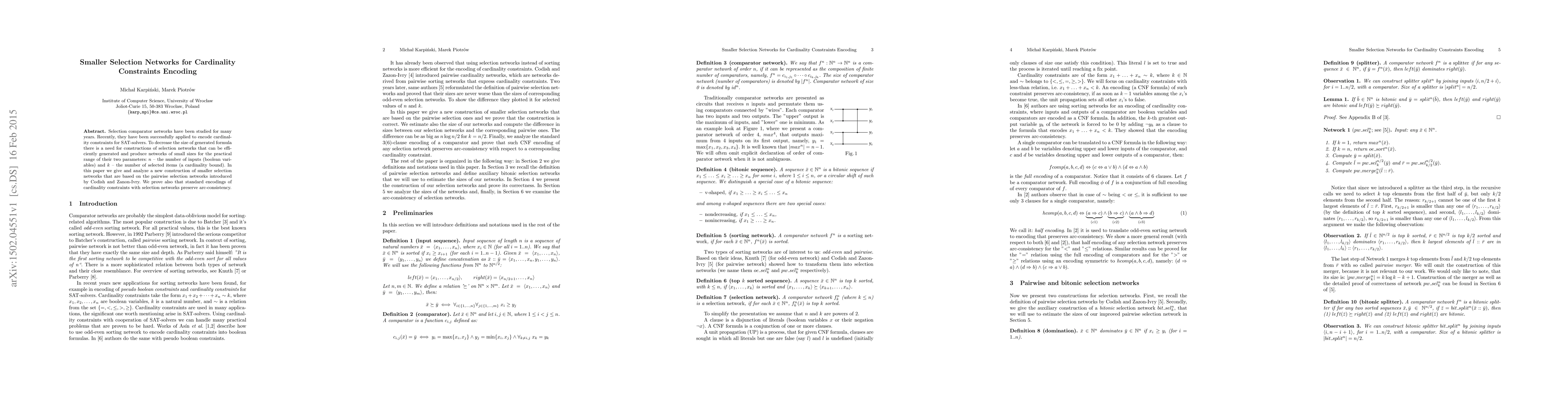 This paper presents a novel construction of smaller selection networks to efficiently encode cardinality constraints for SAT-solvers, improving upon previous pairwise selection networks. It proves that these new networks maintain arc-consistency while reducing the overall size of the formula.