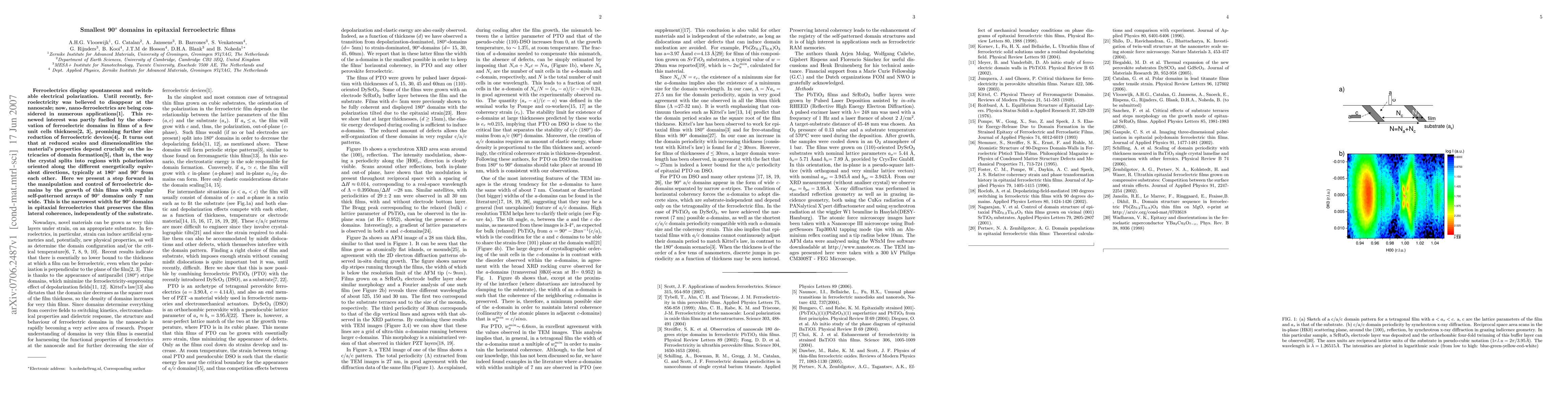 Ferroelectrics display spontaneous and switchable electrical polarization. Until recently, ferroelectricity was believed to disappear at the nanoscale; now, nano-ferroelectrics are being considered in numerous applications. This renewed interest was partly fuelled by the observation of ferroelectric domains in films of a few unit cells thickness, promising further size reduction of ferroelectric devices. It turns out that at reduced scales and dimensionalities the material's properties depend crucially on the intricacies of domain formation, that is, the way the crystal splits into regions with polarization oriented along the different energetically equivalent directions, typically at 180o and 90o from each other. Here we present a step forward in the manipulation and control of ferroelectric domains by the growth of thin films with regular self-patterned arrays of 90o domains only 7 nm wide. This is the narrowest width for 90o domains in epitaxial ferroelectrics that preserves the film lateral coherence, independently of the substrate.