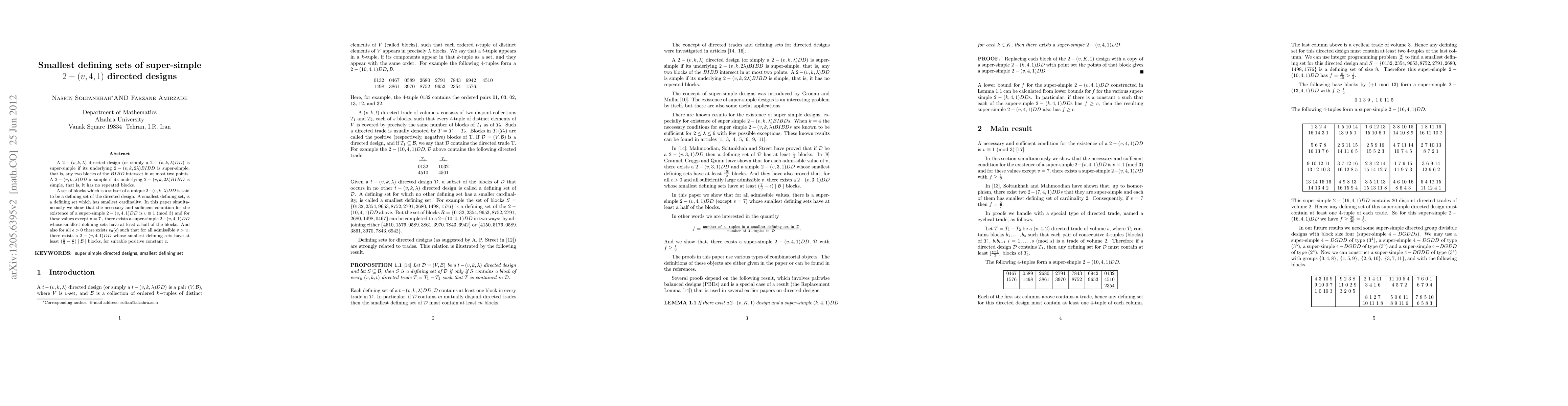 A $2-(v,k,\lambda)$ directed design (or simply a $2-(v,k,\lambda)DD$) is super-simple if its underlying $2-(v,k,2\lambda)BIBD$ is super-simple, that is, any two blocks of the $BIBD$ intersect in at most two points. A $2-(v,k,\lambda)DD$ is simple if its underlying $2-(v,k,2\lambda)BIBD$ is simple, that is, it has no repeated blocks. A set of blocks which is a subset of a unique $2-(v,k,\lambda)DD$ is said to be a defining set of the directed design. A smallest defining set, is a defining set which has smallest cardinality. In this paper simultaneously we show that the necessary and sufficient condition for the existence of a super-simple $2-(v,4,1)DD$ is $v\equiv1\ ({\rm mod}\ 3)$ and for these values except $v=7$, there exists a super-simple $2-(v,4,1)DD$ whose smallest defining sets have at least a half of the blocks. And also for all $\epsilon > 0$ there exists $v_0(\epsilon)$ such that for all admissible $v>v_0$ there exists a $2-(v,4,1)DD$ whose smallest defining sets have at least $(5/8-\frac{c}{v})\mid \mathcal{B}\mid$ blocks, for suitable positive constant c.