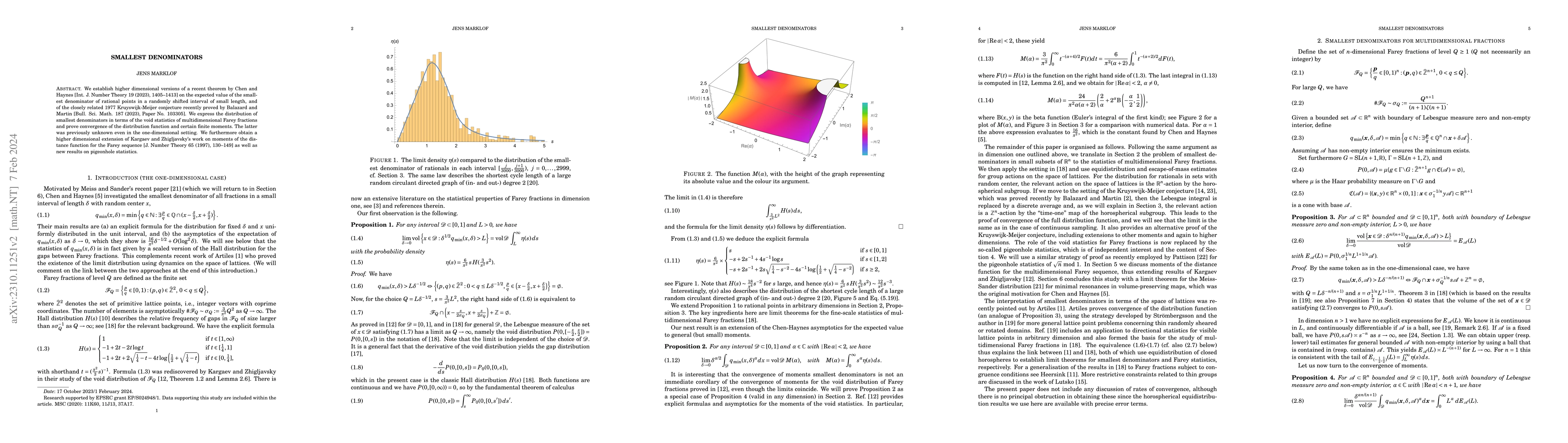 We establish higher dimensional versions of a recent theorem by Chen and Haynes [Int. J. Number Theory 19 (2023), 1405-1413] on the expected value of the smallest denominator of rational points in a randomly shifted interval of small length, and of the closely related 1977 Kruyswijk-Meijer conjecture recently proved by Balazard and Martin [Bull. Sci. Math. 187 (2023), Paper No. 103305]. We express the distribution of smallest denominators in terms of the void statistics of multidimensional Farey fractions and prove convergence of the distribution function and certain finite moments. The latter was previously unknown even in the one-dimensional setting. We furthermore obtain a higher dimensional extension of Kargaev and Zhigljavsky's work on moments of the distance function for the Farey sequence [J. Number Theory 65 (1997), 130-149] as well as new results on pigeonhole statistics.