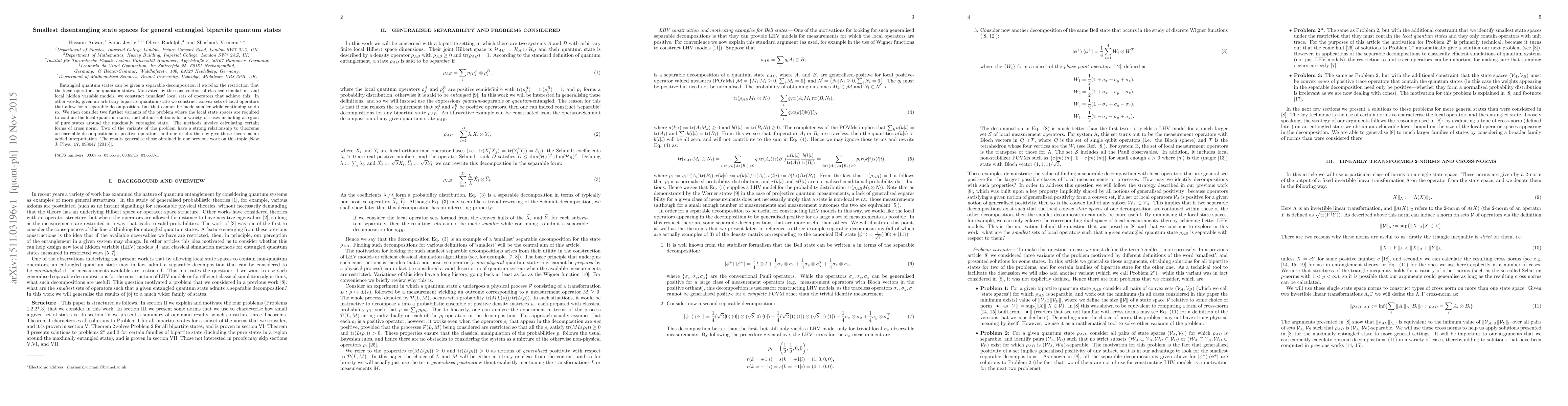 Entangled quantum states can be given a separable decomposition if we relax the restriction that the local operators be quantum states. Motivated by the construction of classical simulations and local hidden variable models, we construct `smallest' local sets of operators that achieve this. In other words, given an arbitrary bipartite quantum state we construct convex sets of local operators that allow for a separable decomposition, but that cannot be made smaller while continuing to do so. We then consider two further variants of the problem where the local state spaces are required to contain the local quantum states, and obtain solutions for a variety of cases including a region of pure states around the maximally entangled state. The methods involve calculating certain forms of cross norm. Two of the variants of the problem have a strong relationship to theorems on ensemble decompositions of positive operators, and our results thereby give those theorems an added interpretation. The results generalise those obtained in our previous work on this topic [New J. Phys. 17, 093047 (2015)].