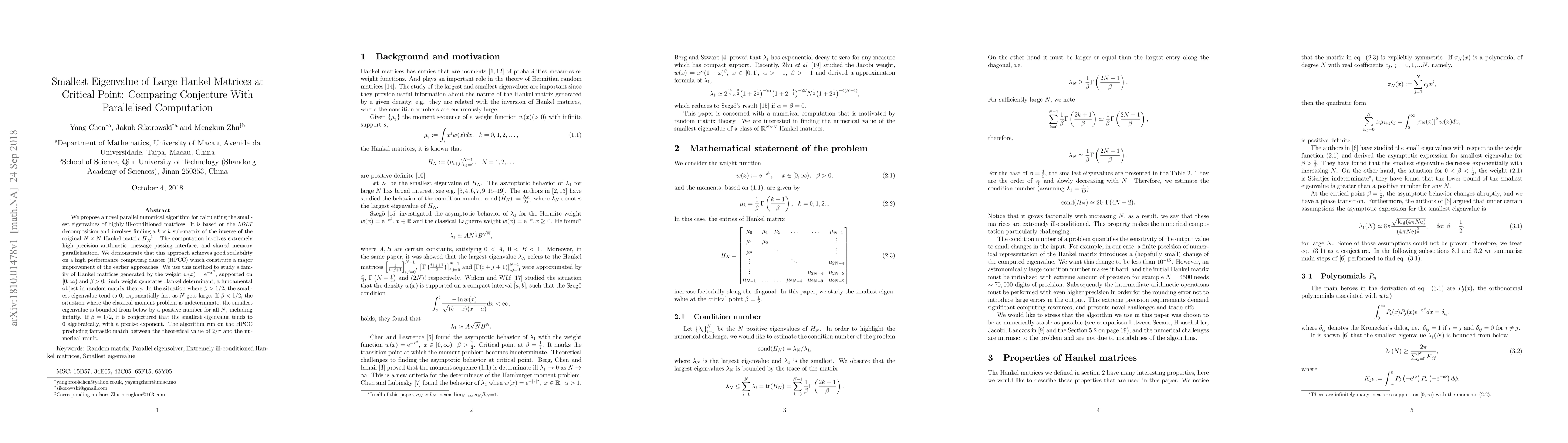 We propose a novel parallel numerical algorithm for calculating the smallest eigenvalues of highly ill-conditioned matrices. It is based on the {\it LDLT} decomposition and involves finding a $k \times k$ sub-matrix of the inverse of the original $N \times N$ Hankel matrix $H_N^{-1}$ . The computation involves extremely high precision arithmetic, message passing interface, and shared memory parallelisation. We demonstrate that this approach achieves good scalability on a high performance computing cluster (HPCC) which constitute a major improvement of the earlier approaches. We use this method to study a family of Hankel matrices generated by the weight $w(x)={\rm e}^{-x^{\beta}},$ supported on $[0,\infty)$ and $\beta>0.$ Such weight generates Hankel determinant, a fundamental object in random matrix theory. In the situation where $\beta>1/2,$ the smallest eigenvalue tend to 0, exponentially fast as $N$ gets large. If $\beta<1/2,$ the situation where the classical moment problem is indeterminate, the smallest eigenvalue is bounded from below by a positive number for all $N$, including infinity. If $\beta=1/2,$ it is conjectured that the smallest eigenvalue tends to 0 algebraically, with a precise exponent. The algorithm run on the HPCC producing fantastic match between the theoretical value of $2/\pi$ and the numerical result.
