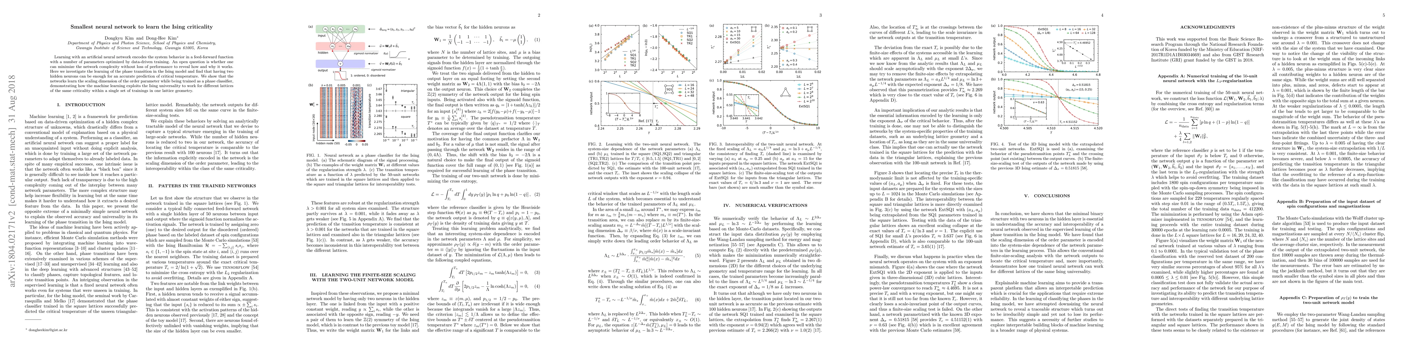 Learning with an artificial neural network encodes the system behavior in a feed-forward function with a number of parameters optimized by data-driven training. An open question is whether one can minimize the network complexity without loss of performance to reveal how and why it works. Here we investigate the learning of the phase transition in the Ising model and find that having two hidden neurons can be enough for an accurate prediction of critical temperature. We show that the networks learn the scaling dimension of the order parameter while being trained as a phase classifier, demonstrating how the machine learning exploits the Ising universality to work for different lattices of the same criticality within a single set of trainings in one lattice geometry.