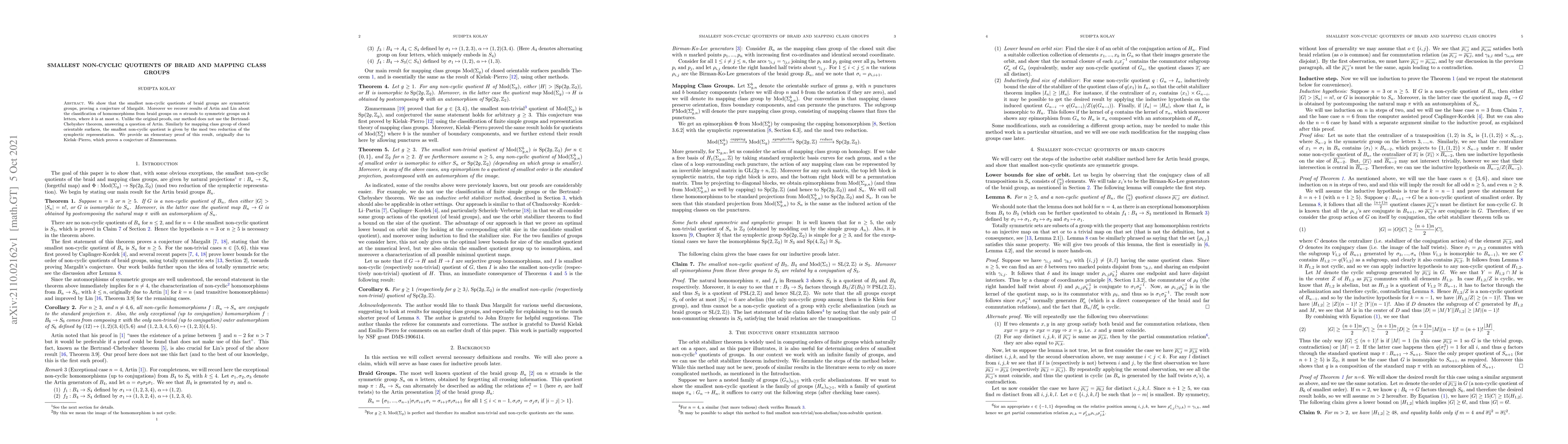 This paper demonstrates that the smallest non-cyclic quotients of braid groups are symmetric groups, confirming Margalit's conjecture, and provides an alternative proof without the Bertrand-Chebyshev theorem. It also establishes the smallest non-cyclic quotient of the mapping class group of closed orientable surfaces as the mod two reduction of the symplectic representation, verifying Zimmermann's conjecture with an elementary proof.
