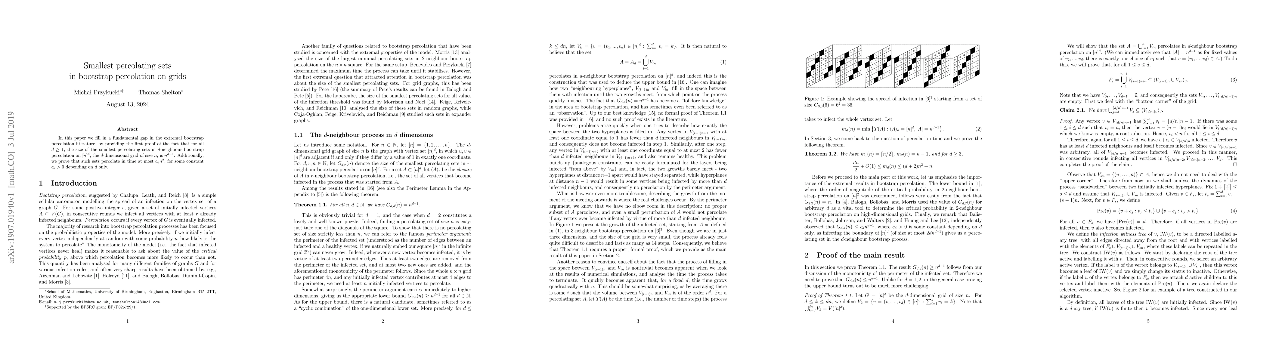 The smallest percolating sets in d-dimensional grid bootstrap percolation have a size of n^{d-1} for all d >= 1, proving a fundamental gap in the literature. These sets also percolate within time at most c_d * n^2, where c_d is a constant depending on d.