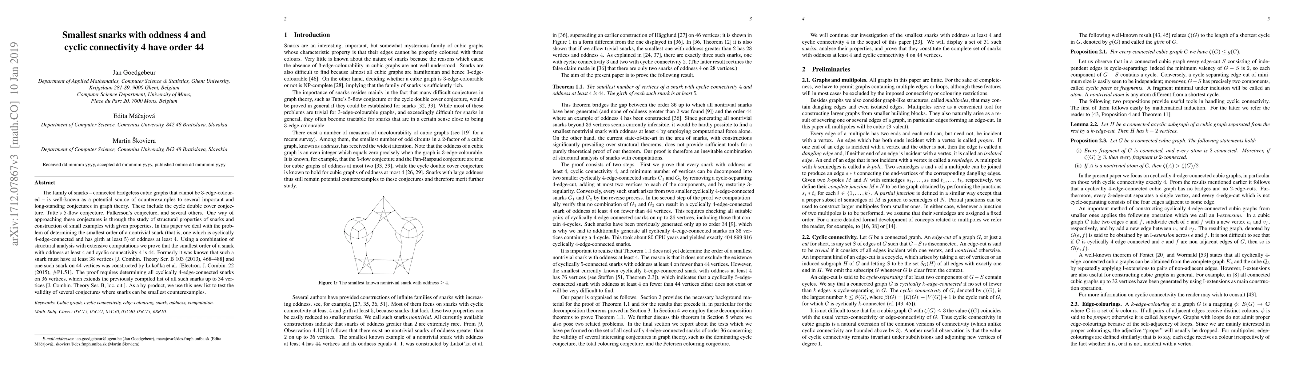 This paper determines that the smallest nontrivial snarks with oddness at least 4 and cyclic connectivity 4 have an order of 44. It combines structural analysis and extensive computations to extend previous findings and test conjectures related to snarks.