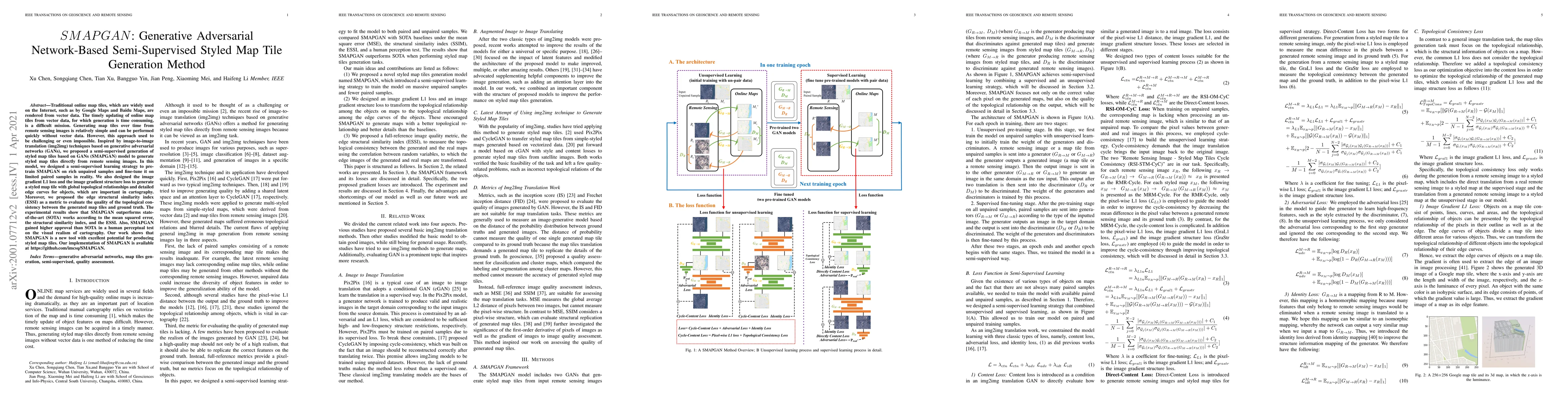 Traditional online map tiles, widely used on the Internet such as Google Map and Baidu Map, are rendered from vector data. Timely updating online map tiles from vector data, of which the generating is time-consuming, is a difficult mission. It is a shortcut to generate map tiles in time from remote sensing images, which can be acquired timely without vector data. However, this mission used to be challenging or even impossible. Inspired by image-to-image translation (img2img) techniques based on generative adversarial networks (GAN), we proposed a semi-supervised Generation of styled map Tiles based on Generative Adversarial Network (SMAPGAN) model to generate styled map tiles directly from remote sensing images. In this model, we designed a semi-supervised learning strategy to pre-train SMAPGAN on rich unpaired samples and fine-tune it on limited paired samples in reality. We also designed image gradient L1 loss and image gradient structure loss to generate a styled map tile with global topological relationships and detailed edge curves of objects, which are important in cartography. Moreover, we proposed edge structural similarity index (ESSI) as a metric to evaluate the quality of topological consistency between generated map tiles and ground truths. Experimental results present that SMAPGAN outperforms state-of-the-art (SOTA) works according to mean squared error, structural similarity index, and ESSI. Also, SMAPGAN won more approval than SOTA in the human perceptual test on the visual realism of cartography. Our work shows that SMAPGAN is potentially a new paradigm to produce styled map tiles. Our implementation of the SMAPGAN is available at https://github.com/imcsq/SMAPGAN.