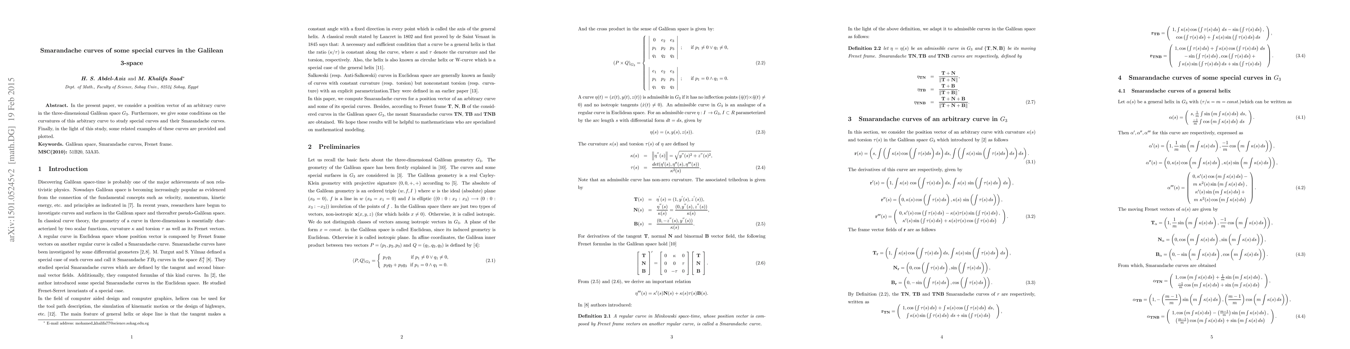 In the present paper, we consider a position vector of an arbitrary curve in the three-dimensional Galilean 3-space. Furthermore, we give some conditions on the curvatures of this arbitrary curve to study special curves and their Smarandache curves. Finally, in the light of this study, some related examples of these curves are provided and plotted