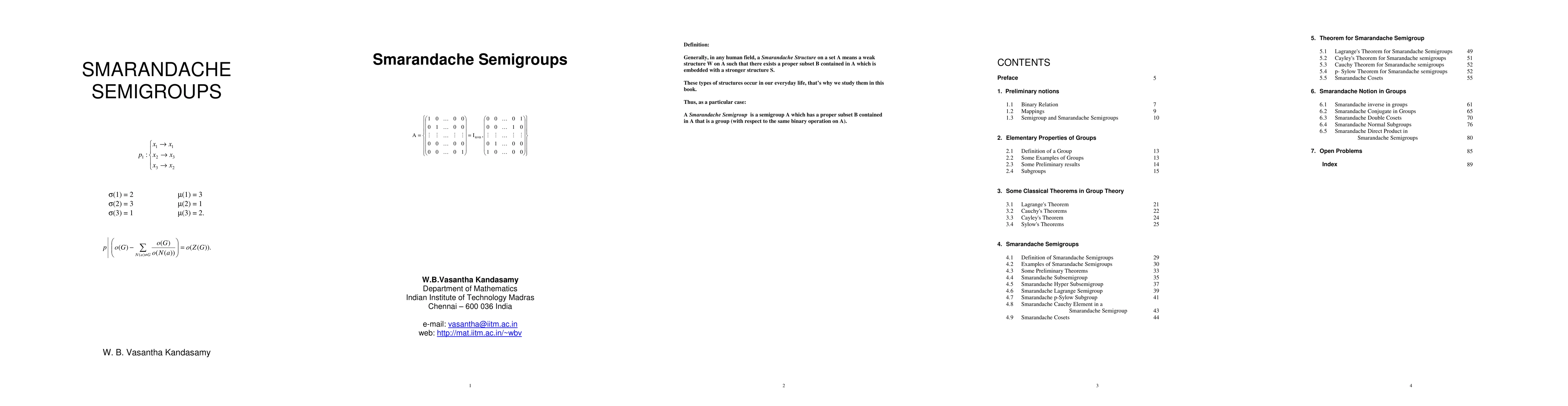 Generally, in any human field, a Smarandache Structure on a set A means a weak structure W on A such that there exists a proper subset B contained in A which is embedded with a stronger structure S. These types of structures occur in our everyday life, that's why we study them in this book. Thus, as a particular case: A Smarandache semigroup is a semigroup A which has a proper subset B contained in A that is a group (with respect to the same binary operation on A).