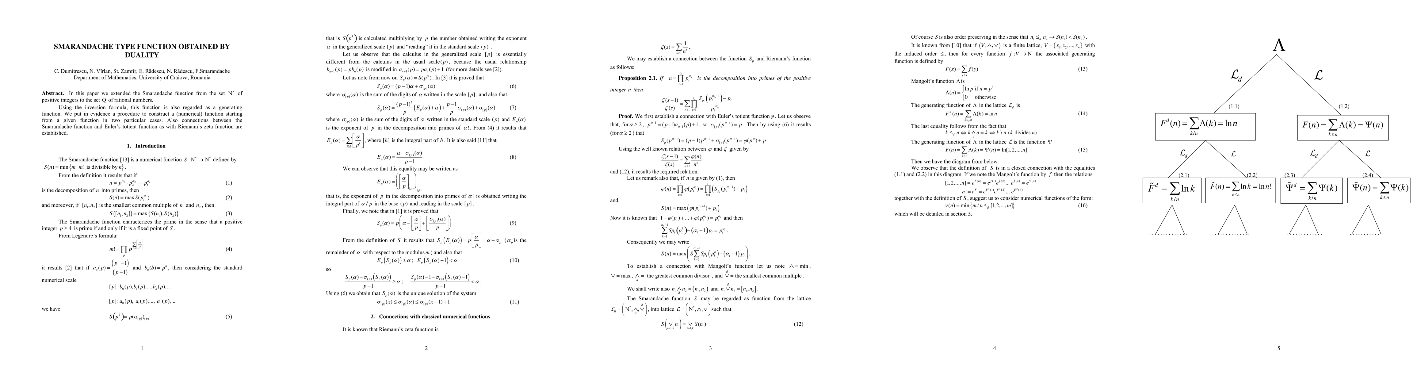In this paper we extend the Smarandache function from the set $N*$ of positive integers to the set $Q$ pf rational numbers. Using the inverse formula, this function is also regarded as a generating function. We put in evidence a procedure to construct a (numerical) function starting from a given function in two particular cases. Also, connections between this function and Euler totient function as well as with Riemann zeta function are established.