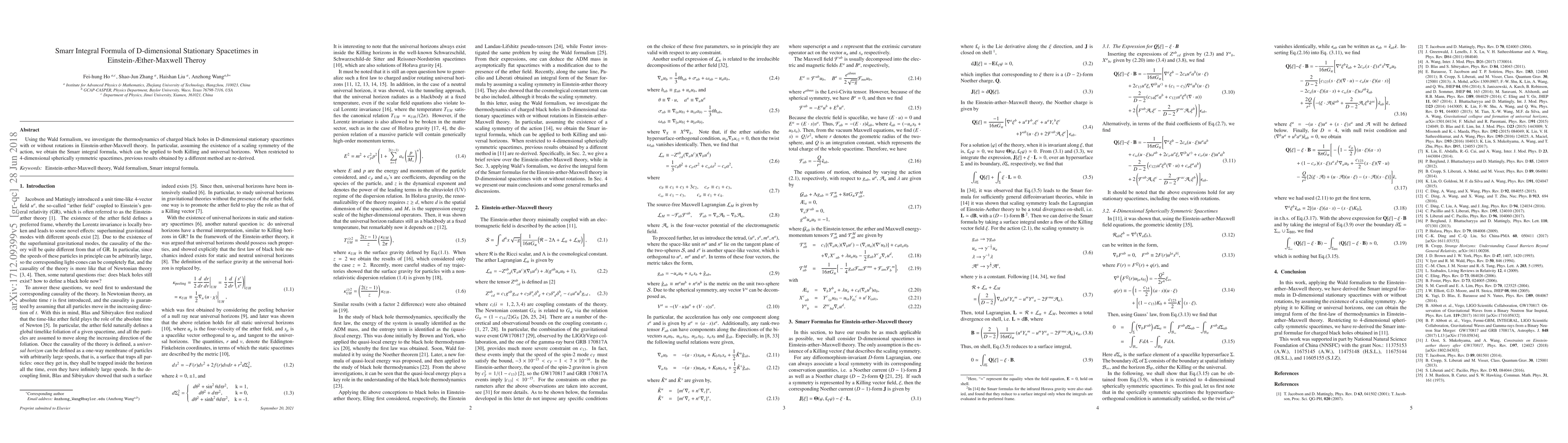 Researchers in Einstein-Á ther-Maxwell theory derive a Smarr integral formula for charged black holes in D-dimensional stationary spacetimes, applying it to both Killing and universal horizons.