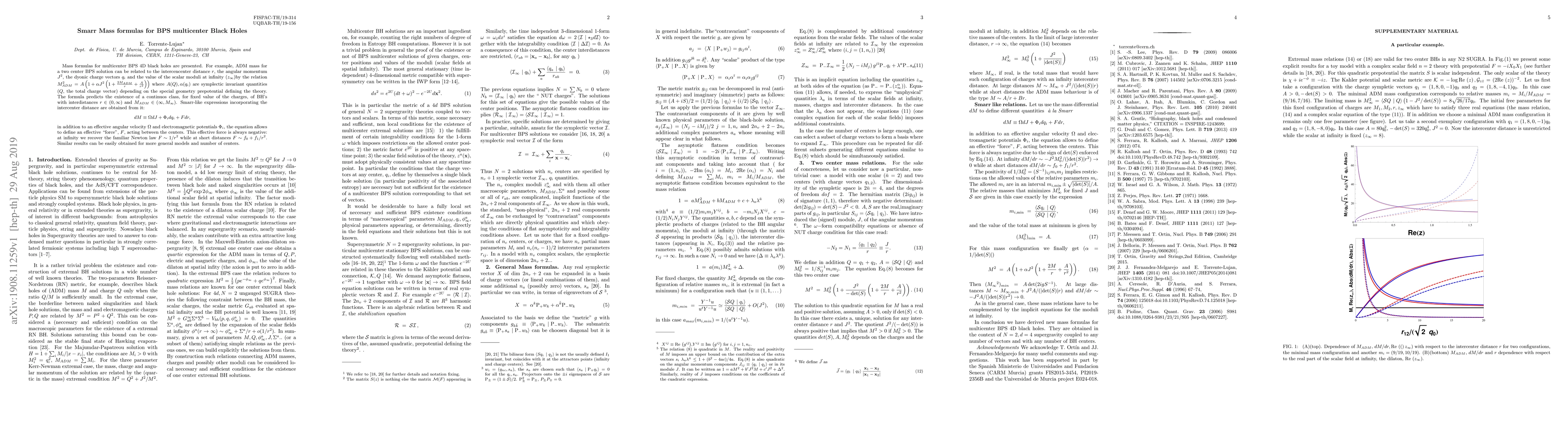Mass formulas for multicenter BPS 4D black holes are presented. For example, ADM mass for a two center BPS solution can be related to the intercencenter distance $r$, the angular momentum $J^2$, the dyonic charge vectors $q_i$ and the value of the scalar moduli at infinity ($z_\infty$)by $M_{ADM}^2 =A\left (1+ \alpha J^2\left(1+\frac{2M_{ADM}}{r}+\frac{A}{r^2}\right)\right)$ where $A(Q),\alpha(q_i)$ are symplectic invariant quantities ($Q$, the total charge vector) depending on the special geometry prepotential defining the theory. The formula predicts the existence of a continuos class, for fixed value of the charges, of BH's with interdistances $r\in (0,\infty)$ and $M_{ADM}\in (\infty,M_\infty)$. Smarr-like expressions incorporating the intercenter distance are obtained from it: $$ dM\equiv\Omega d J+\Phi_i d q_i+ F dr,$$ in addition to an effective angular velocity $\Omega$ and electromagnetic potentials $\Phi_i$, the equation allows to define an effective "force", $F$, acting between the centers. This effective force is always negative: at infinity we recover the familiar Newton law $F\sim 1/r^2$ while at short distances $F\sim f_0+f_1/r^2$. Similar results can be easily obtained for more general models and number of centers.