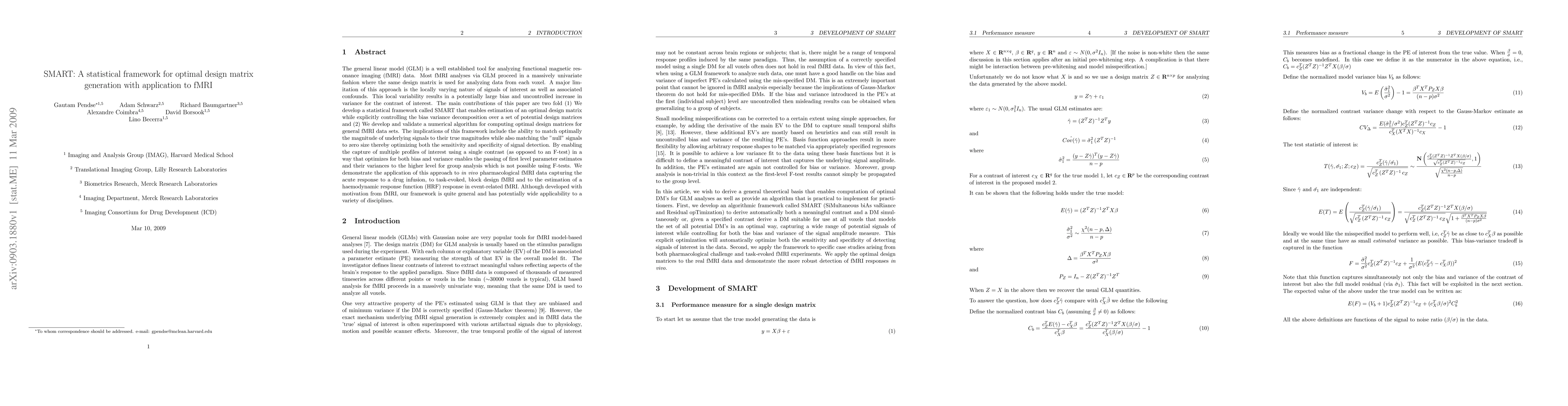 The general linear model (GLM) is a well established tool for analyzing functional magnetic resonance imaging (fMRI) data. Most fMRI analyses via GLM proceed in a massively univariate fashion where the same design matrix is used for analyzing data from each voxel. A major limitation of this approach is the locally varying nature of signals of interest as well as associated confounds. This local variability results in a potentially large bias and uncontrolled increase in variance for the contrast of interest. The main contributions of this paper are two fold (1) We develop a statistical framework called SMART that enables estimation of an optimal design matrix while explicitly controlling the bias variance decomposition over a set of potential design matrices and (2) We develop and validate a numerical algorithm for computing optimal design matrices for general fMRI data sets. The implications of this framework include the ability to match optimally the magnitude of underlying signals to their true magnitudes while also matching the "null" signals to zero size thereby optimizing both the sensitivity and specificity of signal detection. By enabling the capture of multiple profiles of interest using a single contrast (as opposed to an F-test) in a way that optimizes for both bias and variance enables the passing of first level parameter estimates and their variances to the higher level for group analysis which is not possible using F-tests. We demonstrate the application of this approach to in vivo pharmacological fMRI data capturing the acute response to a drug infusion, to task-evoked, block design fMRI and to the estimation of a haemodynamic response function (HRF) response in event-related fMRI. Our framework is quite general and has potentially wide applicability to a variety of disciplines.