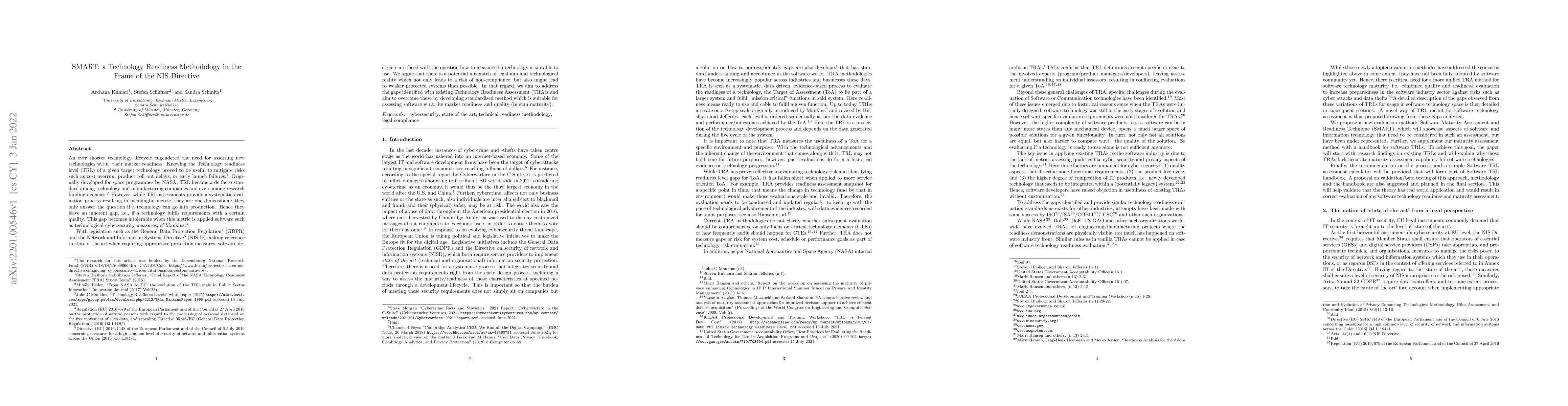 The paper introduces SMART, a new methodology for assessing the technology readiness and quality of software in the context of the NIS Directive. It critiques existing Technology Readiness Levels (TRL) for their one-dimensional focus on production readiness, arguing that they fail to evaluate the quality and compliance of software, especially in cybersecurity, leading to potential non-compliance and weaker systems.