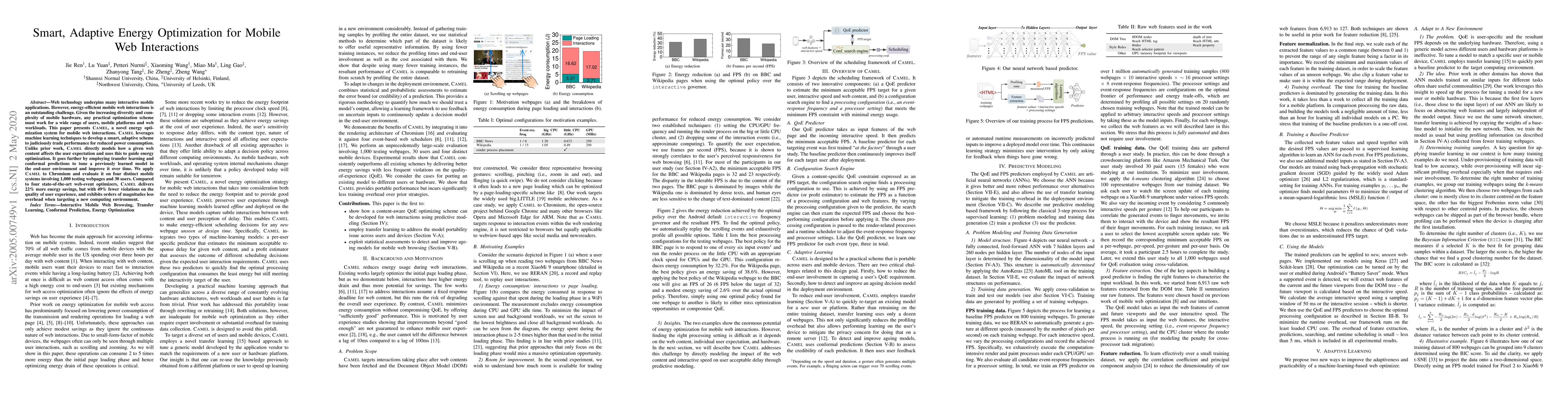 This paper introduces CAMEL, an adaptive energy optimization system for mobile web interactions, which uses machine learning to balance performance and power consumption. CAMEL outperforms existing methods by achieving 22% more energy savings while maintaining user experience quality and reducing overhead.