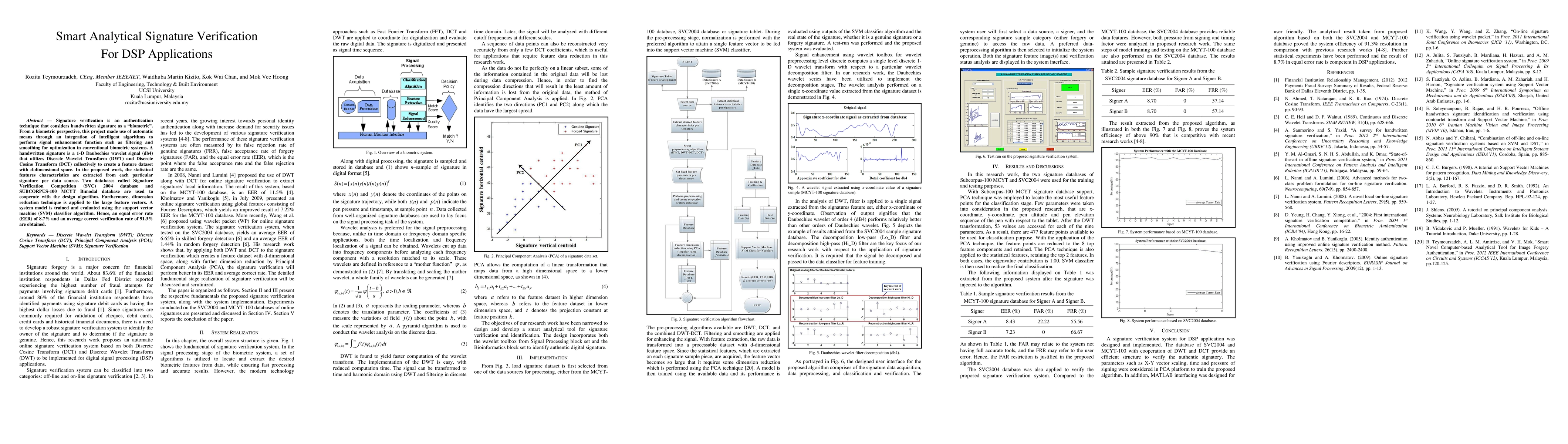 This research develops an intelligent signature verification system using DSP applications that employs wavelet transforms and statistical features for enhanced biometric authentication. The system achieves an EER of 8.7% and a 91.3% correct verification rate using SVM classification on two databases.