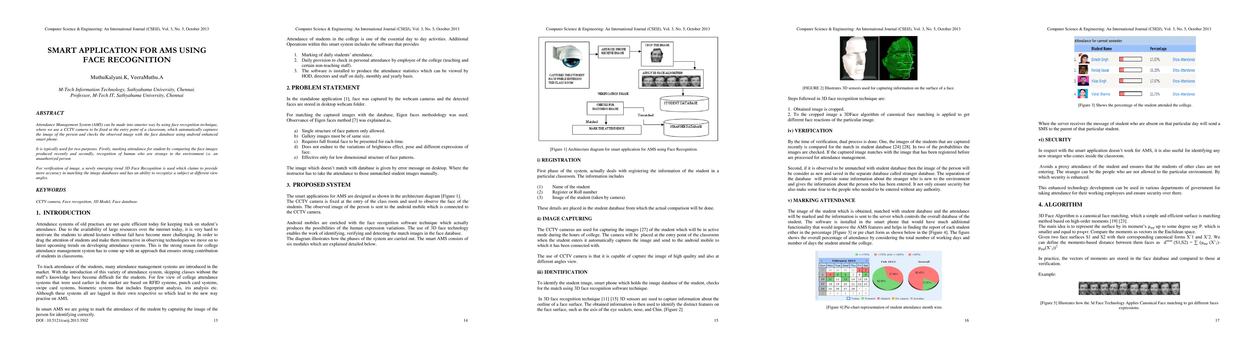 Attendance Management System (AMS) can be made into smarter way by using face recognition technique, where we use a CCTV camera to be fixed at the entry point of a classroom, which automatically captures the image of the person and checks the observed image with the face database using android enhanced smart phone. It is typically used for two purposes. Firstly, marking attendance for student by comparing the face images produced recently and secondly, recognition of human who are strange to the environment i.e. an unauthorized person For verification of image, a newly emerging trend 3D Face Recognition is used which claims to provide more accuracy in matching the image databases and has an ability to recognize a subject at different view angles.