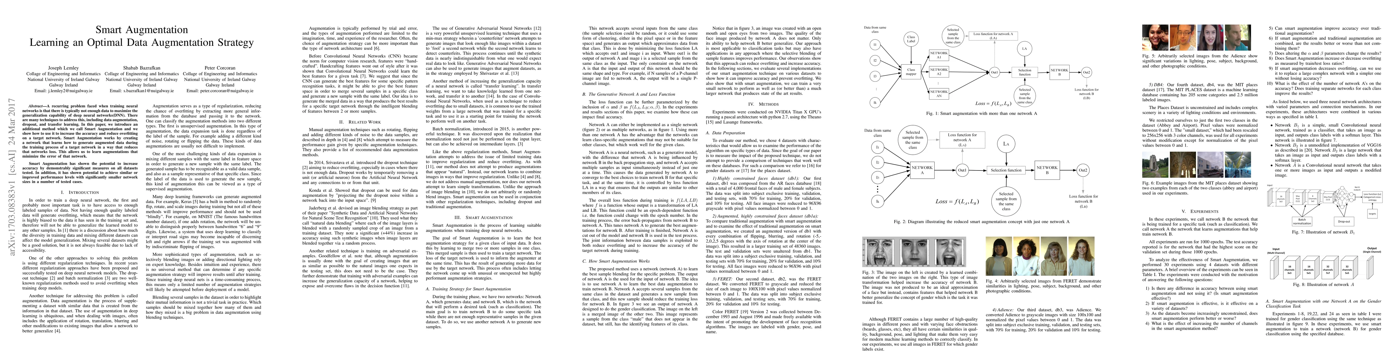 A recurring problem faced when training neural networks is that there is typically not enough data to maximize the generalization capability of deep neural networks(DNN). There are many techniques to address this, including data augmentation, dropout, and transfer learning. In this paper, we introduce an additional method which we call Smart Augmentation and we show how to use it to increase the accuracy and reduce overfitting on a target network. Smart Augmentation works by creating a network that learns how to generate augmented data during the training process of a target network in a way that reduces that networks loss. This allows us to learn augmentations that minimize the error of that network. Smart Augmentation has shown the potential to increase accuracy by demonstrably significant measures on all datasets tested. In addition, it has shown potential to achieve similar or improved performance levels with significantly smaller network sizes in a number of tested cases.