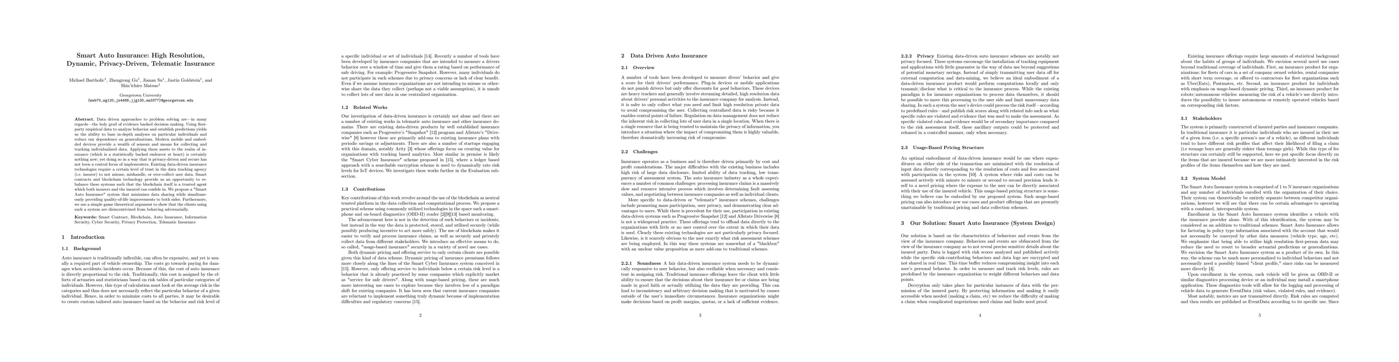 Data driven approaches to problem solving are, in many regards, the holy grail of evidence backed decision making. Using first-party empirical data to analyze behavior and establish predictions yields us the ability to base in-depth analyses on particular individuals and reduce our dependence on generalizations. Modern mobile and embedded devices provide a wealth of sensors and means for collecting and tracking individualized data. Applying these assets to the realm of insurance (which is a statistically backed endeavor at heart) is certainly nothing new; yet doing so in a way that is privacy-driven and secure has not been a central focus of implementers. Existing data-driven insurance technologies require a certain level of trust in the data tracking agency (i.e. insurer) to not misuse, mishandle, or over-collect user data. Smart contracts and blockchain technology provide us an opportunity to re-balance these systems such that the blockchain itself is a trusted agent which both insurers and the insured can confide in. We propose a "Smart Auto Insurance" system that minimizes data sharing while simultaneously providing quality-of-life improvements to both sides. Furthermore, we use a simple game theoretical argument to show that the clients using such a system are disincentivized from behaving adversarially.