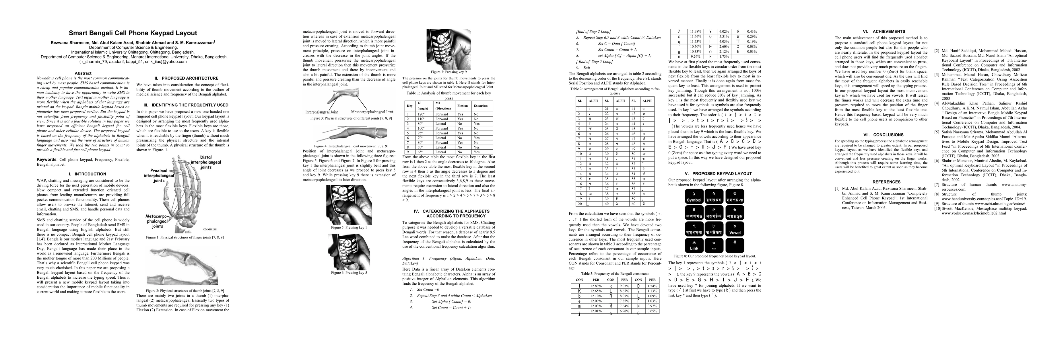 Nowadays cell phone is the most common communicating used by mass people. SMS based communication is a cheap and popular communication method. It is human tendency to have the opportunity to write SMS in their mother language. Text input in mother language is more flexible when the alphabets of that language are printed on the keypad. Bangla mobile keypad based on phonetics has been proposed earlier. But the keypad is not scientific from frequency and flexibility point of view. Since it is not a feasible solution in this paper we have proposed an efficient Bengali keypad for cell phone and other cellular device. The proposed keypad is based on the frequency of the alphabets in Bengali language and also with the view of structure of human finger movements. We took the two points in count to provide a flexible and fast cell phone keypad.