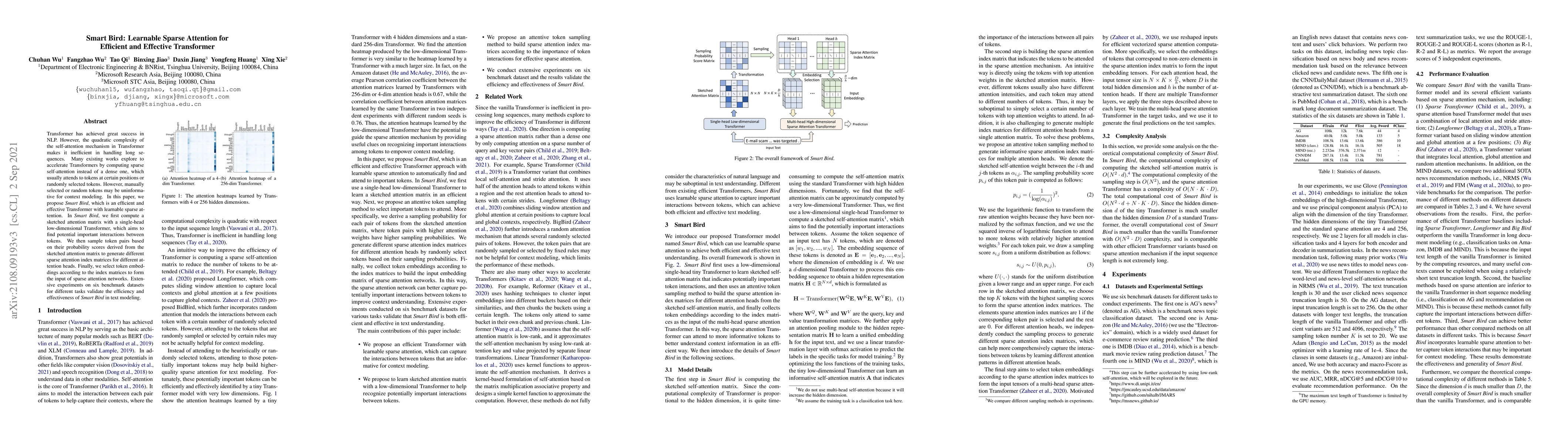Smart Bird proposes a learnable sparse attention mechanism for efficient Transformers, addressing the quadratic complexity of dense self-attention. It uses a sketched attention matrix to identify important token interactions, then samples token pairs to generate sparse attention indices, demonstrating improved efficiency and effectiveness on various NLP tasks.