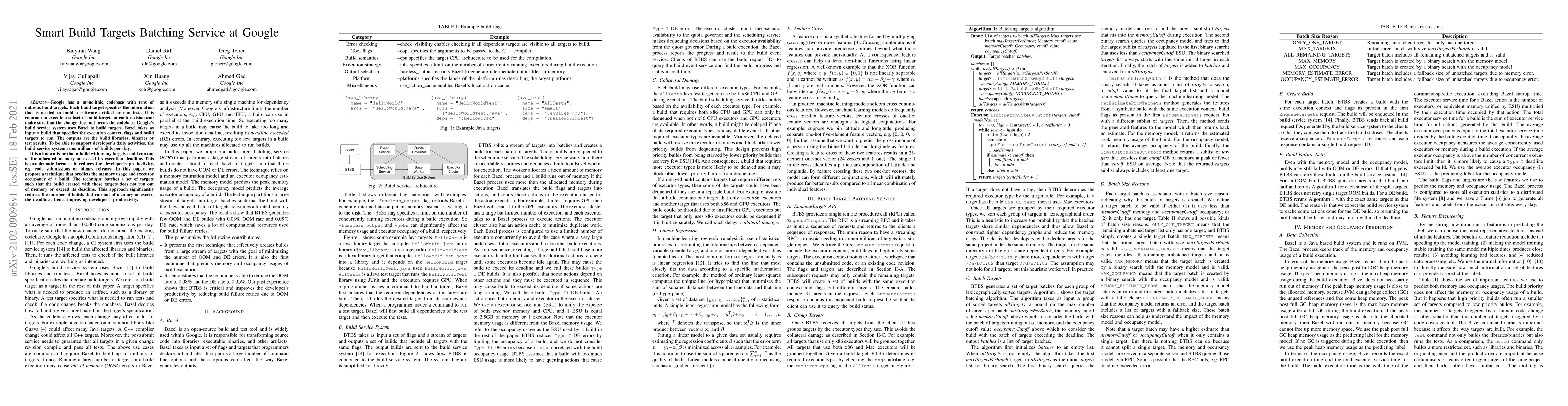 Google has a monolithic codebase with tens of millions build targets. Each build target specifies the information that is needed to build a software artifact or run tests. It is common to execute a subset of build targets at each revision and make sure that the change does not break the codebase. Google's build service system uses Bazel to build targets. Bazel takes as input a build that specifies the execution context, flags and build targets to run. The outputs are the build libraries, binaries or test results. To be able to support developer's daily activities, the build service system runs millions of builds per day. It is a known issue that a build with many targets could run out of the allocated memory or exceed its execution deadline. This is problematic because it reduces the developer's productivity, e.g. code submissions or binary releases. In this paper, we propose a technique that predicts the memory usage and executor occupancy of a build. The technique batches a set of targets such that the build created with those targets does not run out of memory or exceed its deadline. This approach significantly reduces the number of builds that run out of memory or exceed the deadlines, hence improving developer's productivity.
