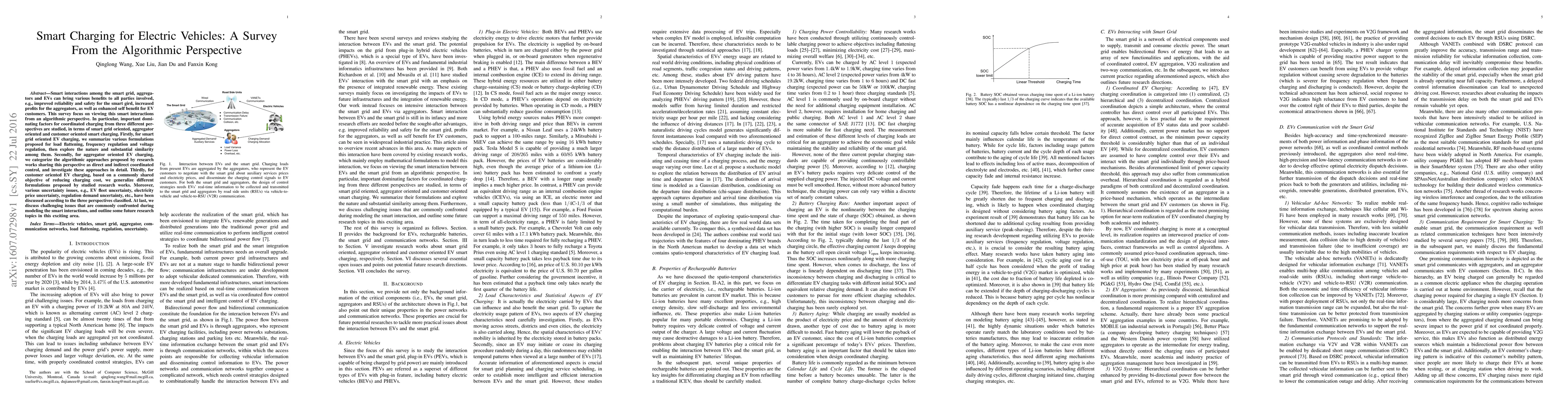 This paper surveys smart charging algorithms for electric vehicles (EVs) from three perspectives: smart grid, aggregator, and customer. It categorizes and analyzes algorithms for load flattening, frequency regulation, and customer cost reduction, while addressing uncertainties and future research directions.
