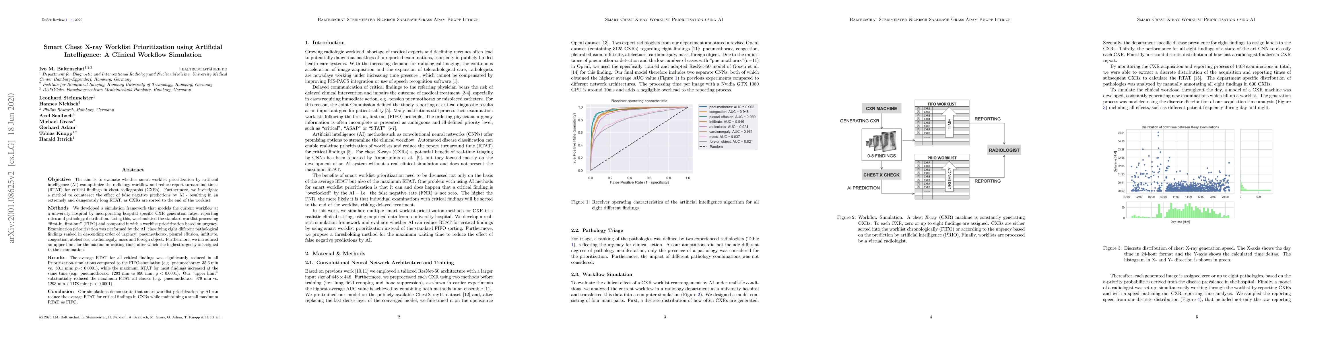 The aim is to evaluate whether smart worklist prioritization by artificial intelligence (AI) can optimize the radiology workflow and reduce report turnaround times (RTAT) for critical findings in chest radiographs (CXRs). Furthermore, we investigate a method to counteract the effect of false negative predictions by AI -- resulting in an extremely and dangerously long RTAT, as CXRs are sorted to the end of the worklist. We developed a simulation framework that models the current workflow at a university hospital by incorporating hospital specific CXR generation rates, reporting rates and pathology distribution. Using this, we simulated the standard worklist processing "first-in, first-out" (FIFO) and compared it with a worklist prioritization based on urgency. Examination prioritization was performed by the AI, classifying eight different pathological findings ranked in descending order of urgency: pneumothorax, pleural effusion, infiltrate, congestion, atelectasis, cardiomegaly, mass and foreign object. Furthermore, we introduced an upper limit for the maximum waiting time, after which the highest urgency is assigned to the examination. The average RTAT for all critical findings was significantly reduced in all Prioritization-simulations compared to the FIFO-simulation (e.g. pneumothorax: 35.6 min vs. 80.1 min; p $<0.0001$), while the maximum RTAT for most findings increased at the same time (e.g. pneumothorax: 1293 min vs 890 min; p $<0.0001$). Our "upper limit" substantially reduced the maximum RTAT all classes (e.g. pneumothorax: 979 min vs. 1293 min / 1178 min; p $<0.0001$). Our simulations demonstrate that smart worklist prioritization by AI can reduce the average RTAT for critical findings in CXRs while maintaining a small maximum RTAT as FIFO.