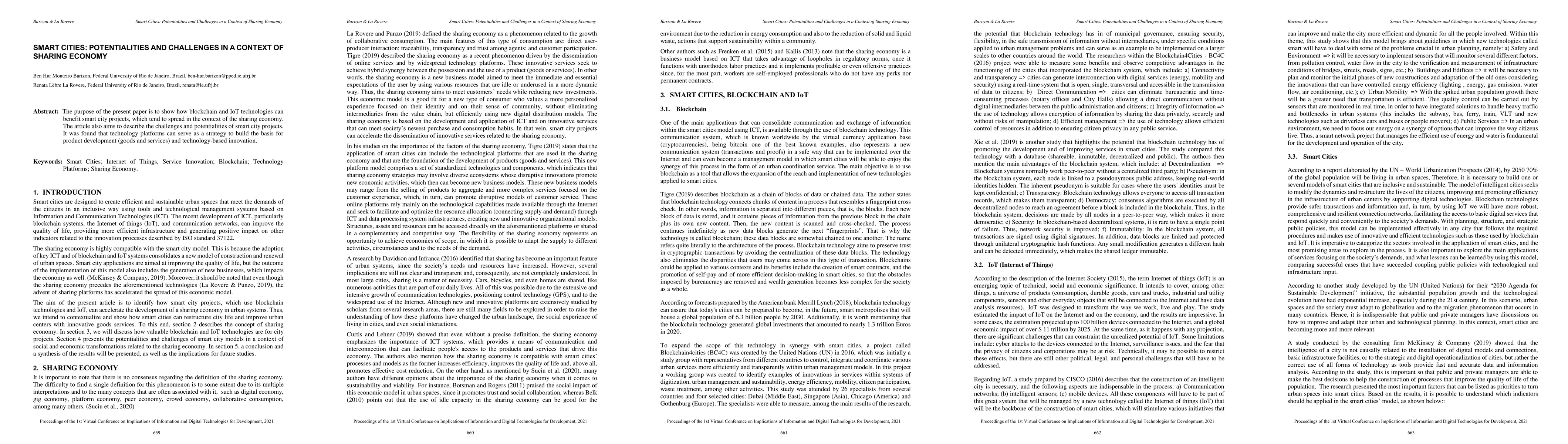 The purpose of the present paper is to show how blockchain and IoT technologies can benefit smart city projects, which tend to spread in the context of the sharing economy. The article also aims to describe the challenges and potentialities of smart city projects. It was found that technology platforms can serve as a strategy to build the basis for product development (goods and services) and technology-based innovation.