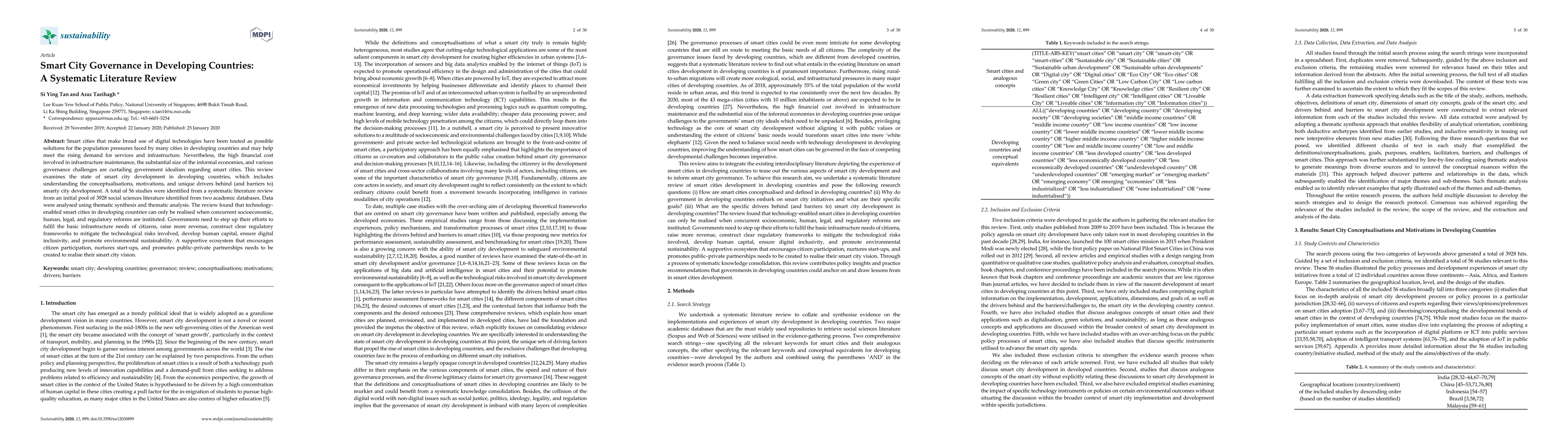 This systematic literature review explores smart city governance in developing countries, identifying key drivers and barriers. It concludes that successful implementation requires comprehensive socioeconomic, human, legal, and regulatory reforms, alongside enhanced citizen participation and public-private partnerships.
