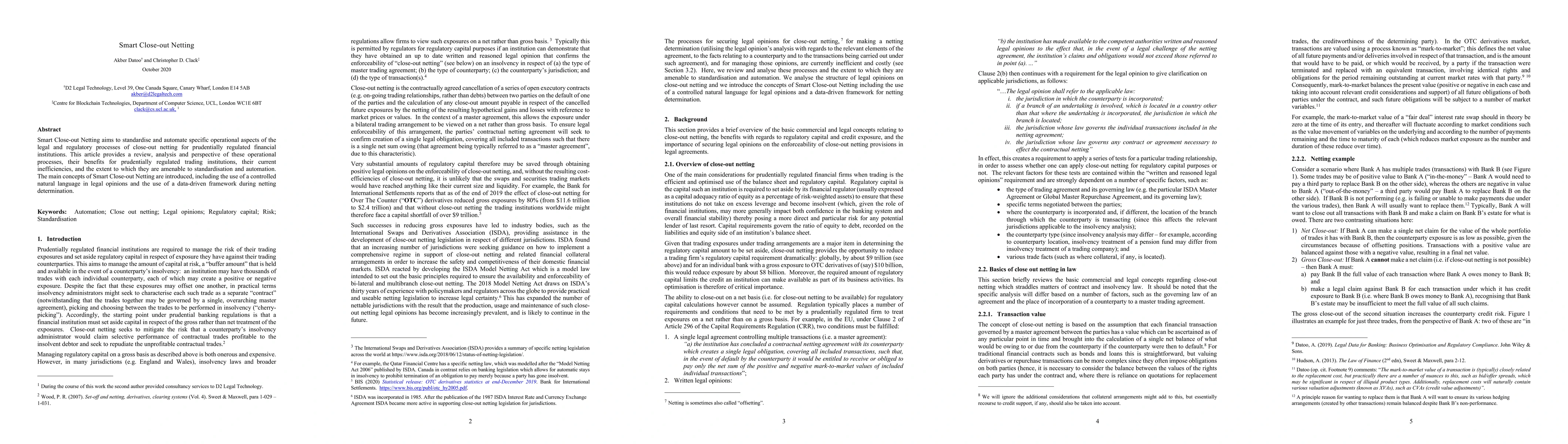 Smart Close-out Netting standardizes and automates operational processes in legal and regulatory close-out netting for financial institutions. It introduces controlled natural language in legal opinions and a data-driven framework for netting determination, addressing current inefficiencies and promising improved operational efficiency.