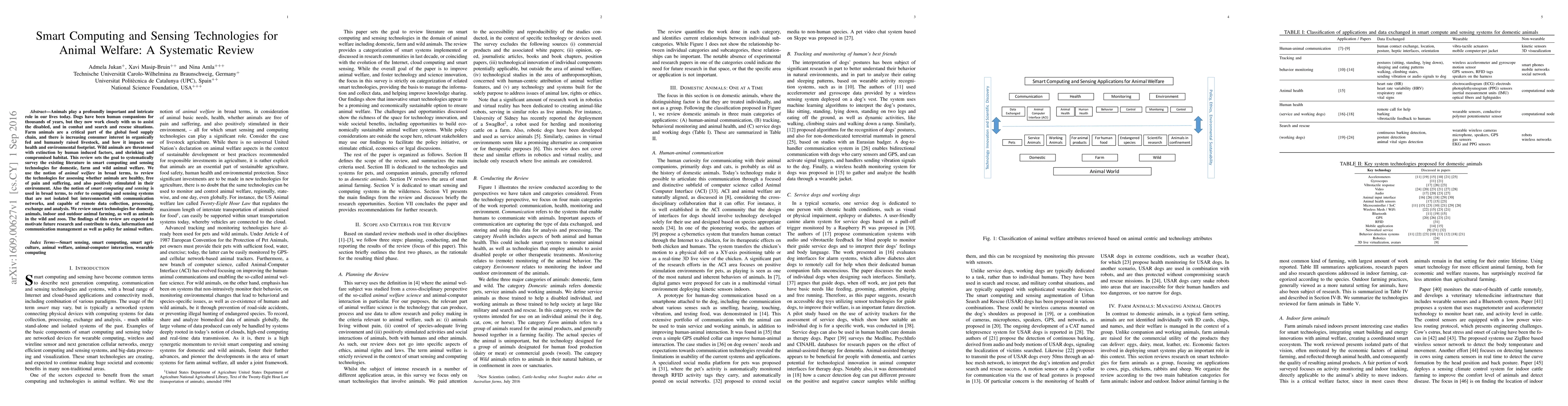 Animals play a profoundly important and intricate role in our lives today. Dogs have been human companions for thousands of years, but they now work closely with us to assist the disabled, and in combat and search and rescue situations. Farm animals are a critical part of the global food supply chain, and there is increasing consumer interest in organically fed and humanely raised livestock, and how it impacts our health and environmental footprint. Wild animals are threatened with extinction by human induced factors, and shrinking and compromised habitat. This review sets the goal to systematically survey the existing literature in smart computing and sensing technologies for domestic, farm and wild animal welfare. We use the notion of \emph{animal welfare} in broad terms, to review the technologies for assessing whether animals are healthy, free of pain and suffering, and also positively stimulated in their environment. Also the notion of \emph{smart computing and sensing} is used in broad terms, to refer to computing and sensing systems that are not isolated but interconnected with communication networks, and capable of remote data collection, processing, exchange and analysis. We review smart technologies for domestic animals, indoor and outdoor animal farming, as well as animals in the wild and zoos. The findings of this review are expected to motivate future research and contribute to data, information and communication management as well as policy for animal welfare.