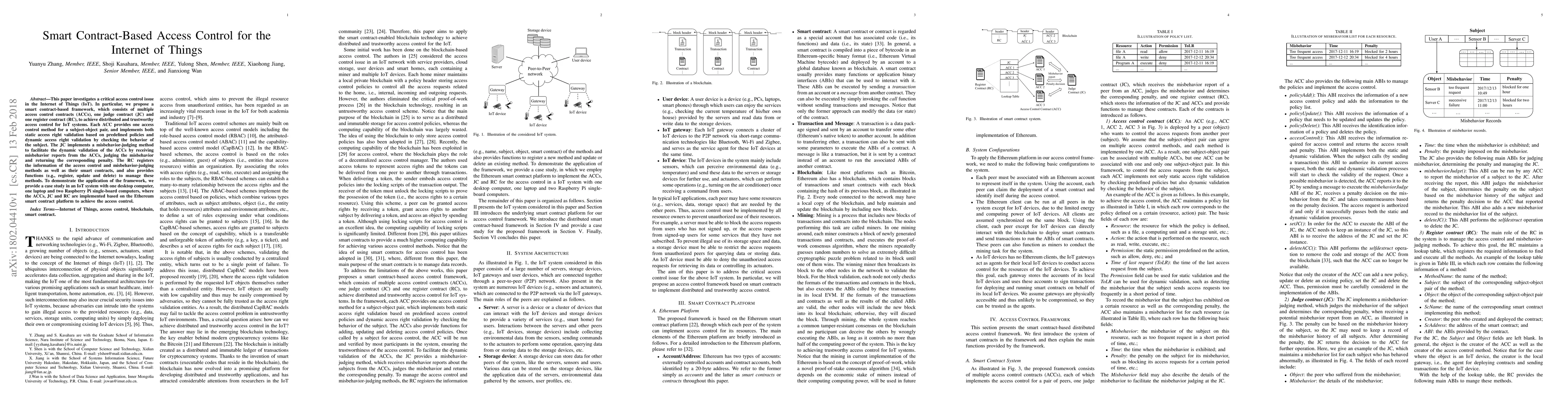 This paper proposes a smart contract-based framework for distributed and trustworthy access control in IoT systems, utilizing multiple access control contracts, a judge contract, and a register contract to manage access rights and misbehavior penalties. A case study demonstrates its application in an IoT setup with various devices on the Ethereum platform.