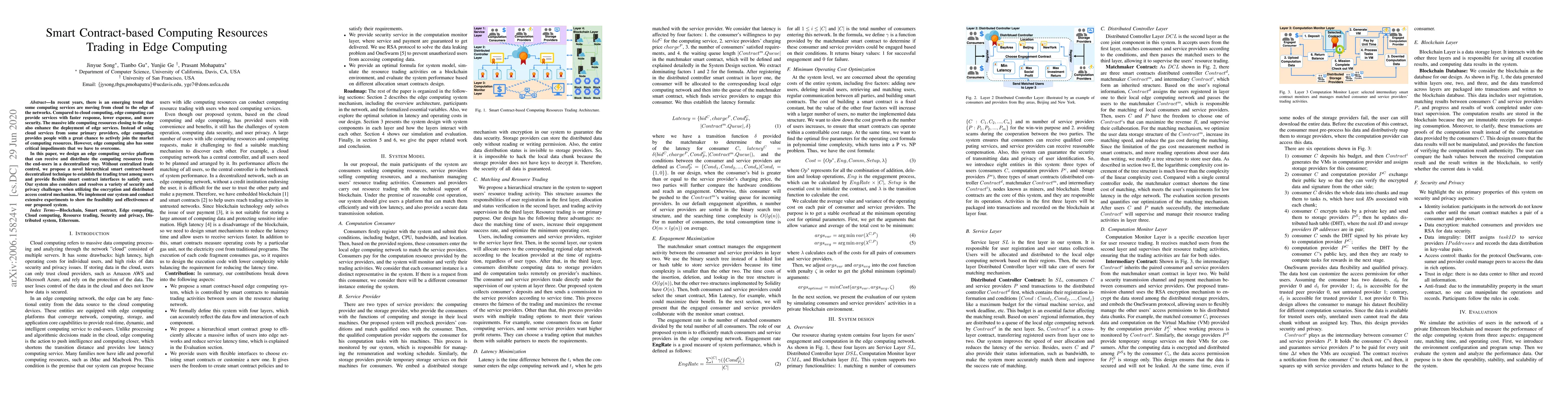 This paper proposes a decentralized edge computing service platform utilizing smart contracts to enable peer-to-peer trading of computing resources, addressing security and privacy challenges through encryption and distributed access control, and demonstrating its feasibility through experiments.