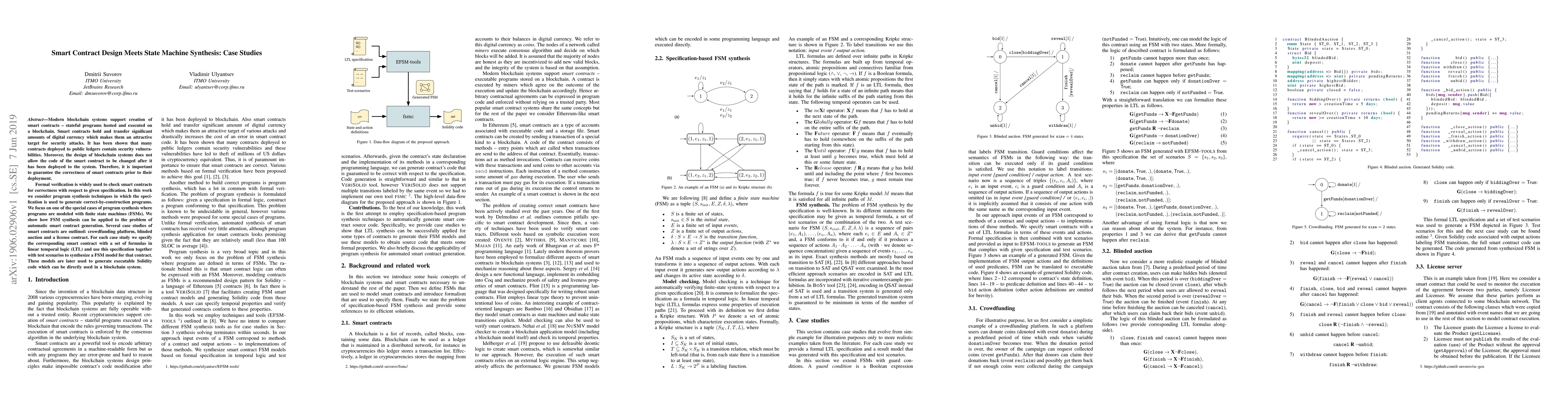 This paper explores the application of state machine synthesis techniques to automatically generate secure smart contracts from formal specifications. Through case studies on crowdfunding, auctions, and licensing, it demonstrates how linear temporal logic specifications and test scenarios can be used to synthesize finite state machine models, which are then translated into executable Solidity code for blockchain deployment.