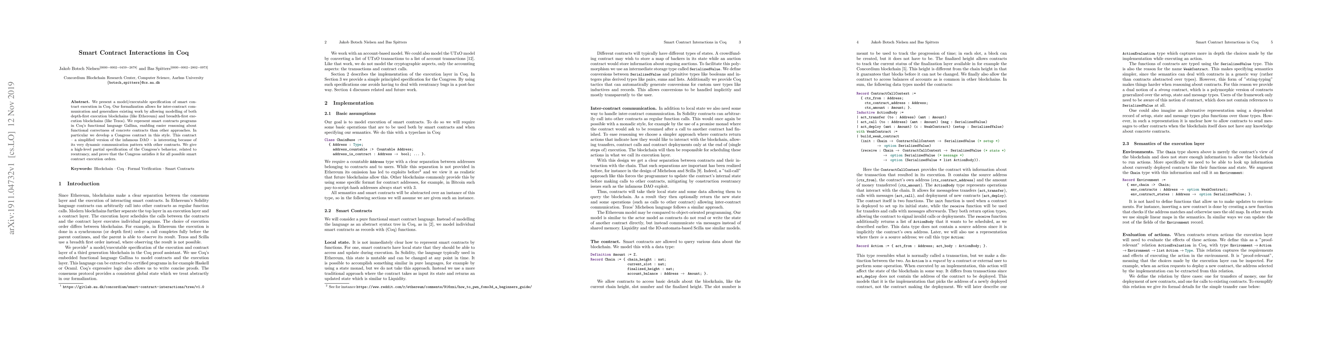 This paper presents a formal model of smart contract execution in Coq, supporting both depth-first and breadth-first blockchains. It introduces a Congress contract, a simplified DAO, demonstrating dynamic inter-contract communication and proving its reentrancy-free behavior for all execution orders.